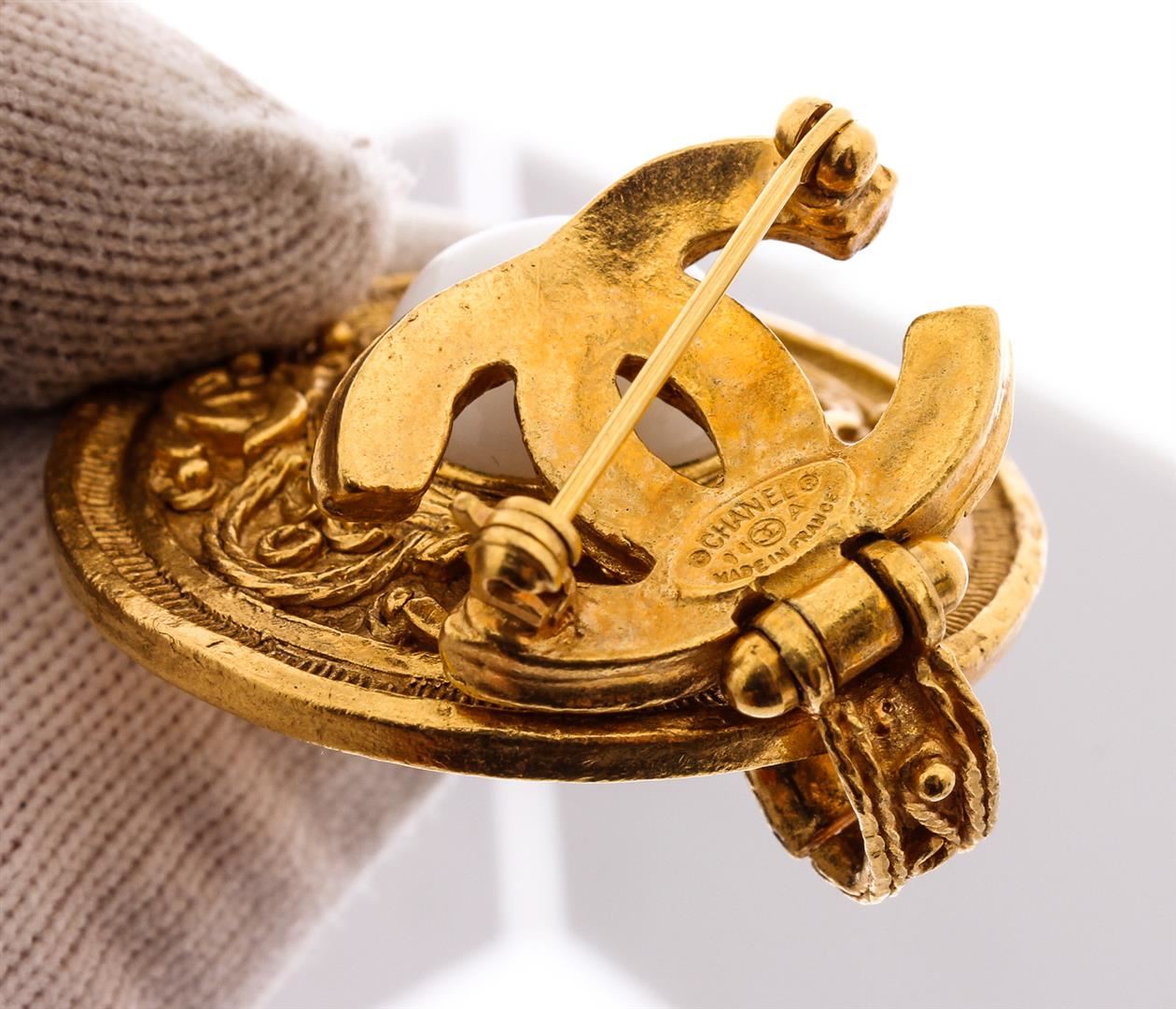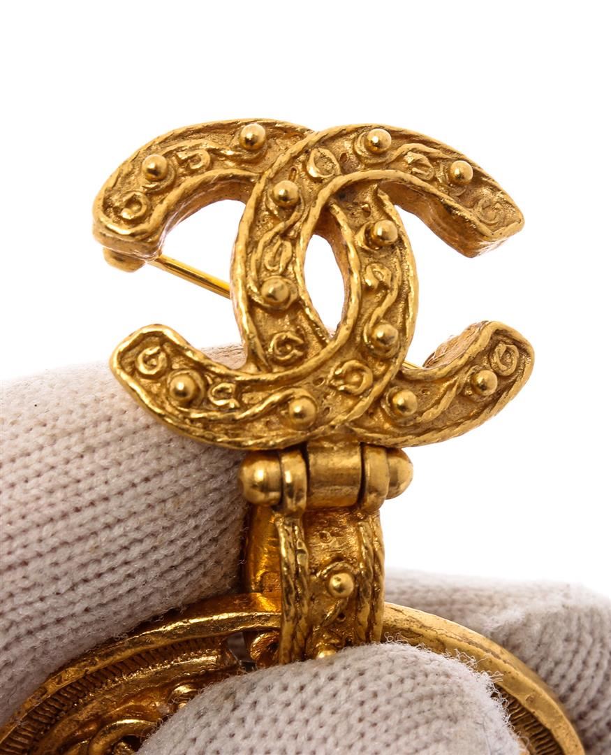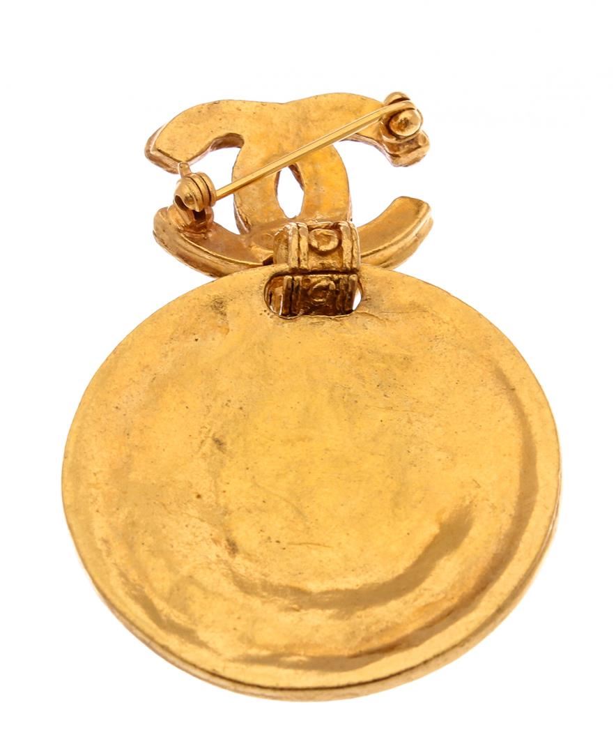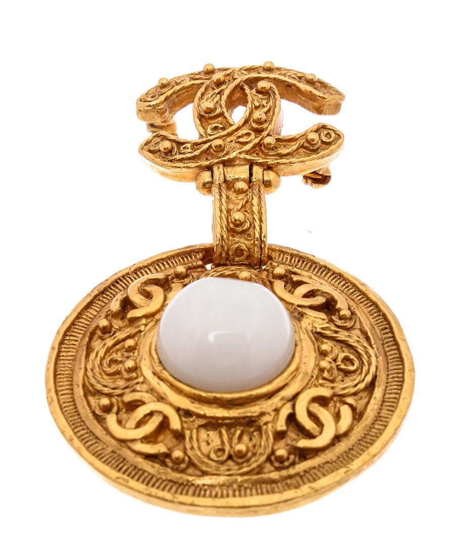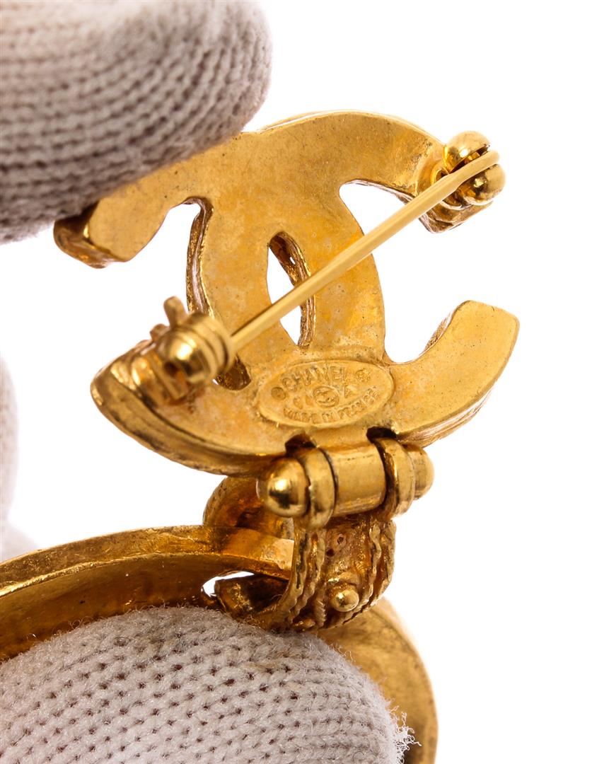 Gold-tone Chanel vintage CC drop brooch featuring Gripoix accent and pin closure.