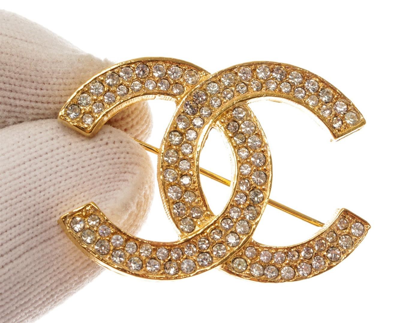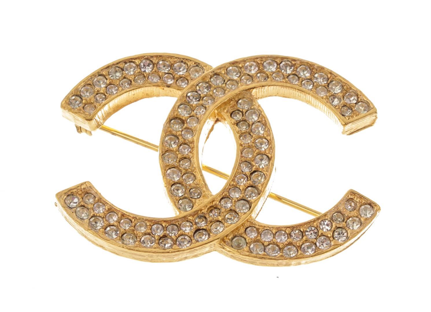 One Chanel Vintage Gold-tone Metal CC Rhinestone Brooch. Item is sold AS-IS. All available information is listed in the description and shown in the photo. Chanel Vintage Gold-tone Metal CC Rhinestone Brooch features CC logo Chanel brooch with rhinestones, gold-tone hardware and safety-pin closure clasp.