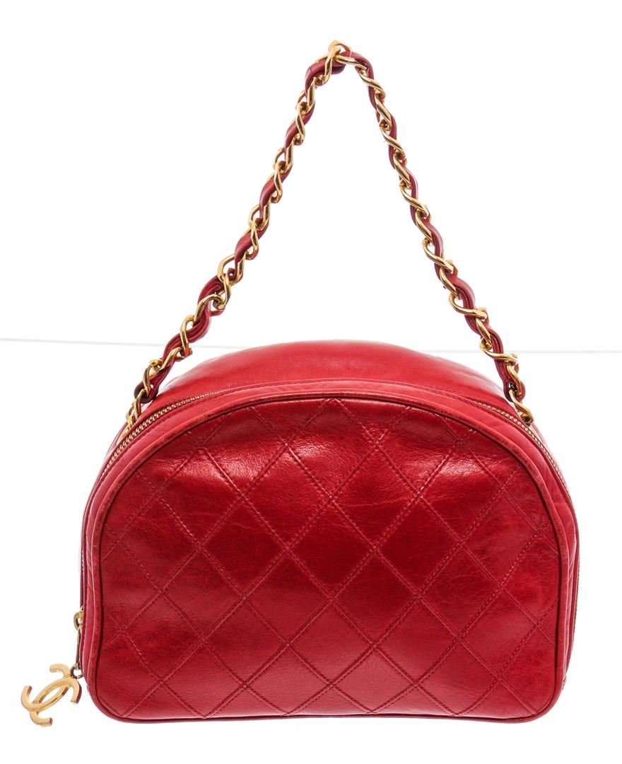 Red quilted leather Chanel Vintage camera shoulder bag with gold-tone hardware, single-chain link and leather shoulder strap, tonal leather lining, one zip pocket at interior wall and overall zipper closure at top.