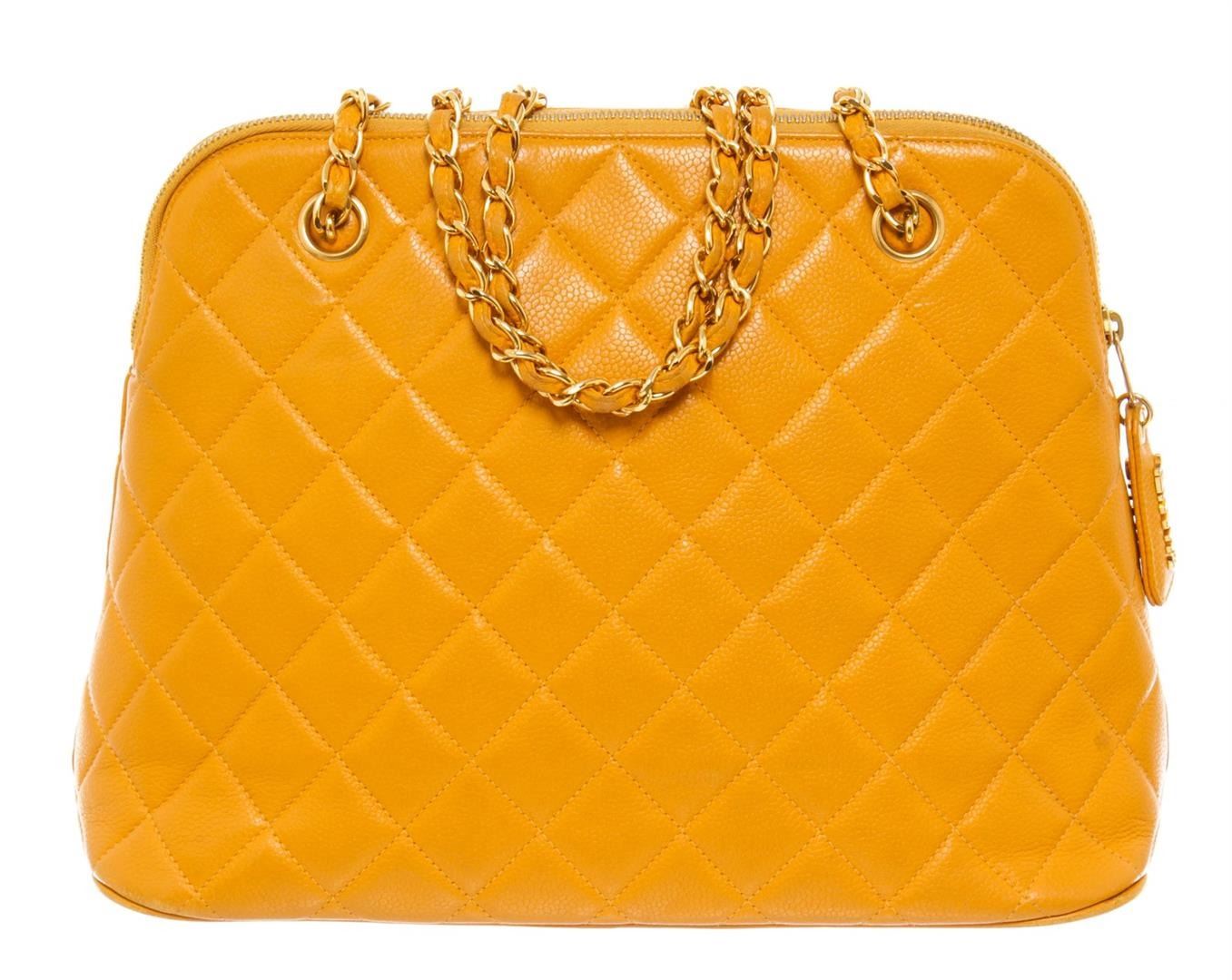 One Chanel Vintage Yellow Caviarskin Leather Matelasse Chain Shoulder Bag. Item is sold AS-IS. All available information is listed in the description and shown in the photo. Chanel Matelasse Shoulder Bag in yellow quilted Caviar leather and has gold-tone hardware. It has a unique rounded top shape with a wrap-around zipper closure. The zipper has a stylish zipper tag with "CHANEL" in large gold letters. The bottom has a large CC logo stitched and embossed on. The inside is lined with yellow lambskin leather and has one zipper and one slip pocket. 11.4" x 4.3" x 8.7"