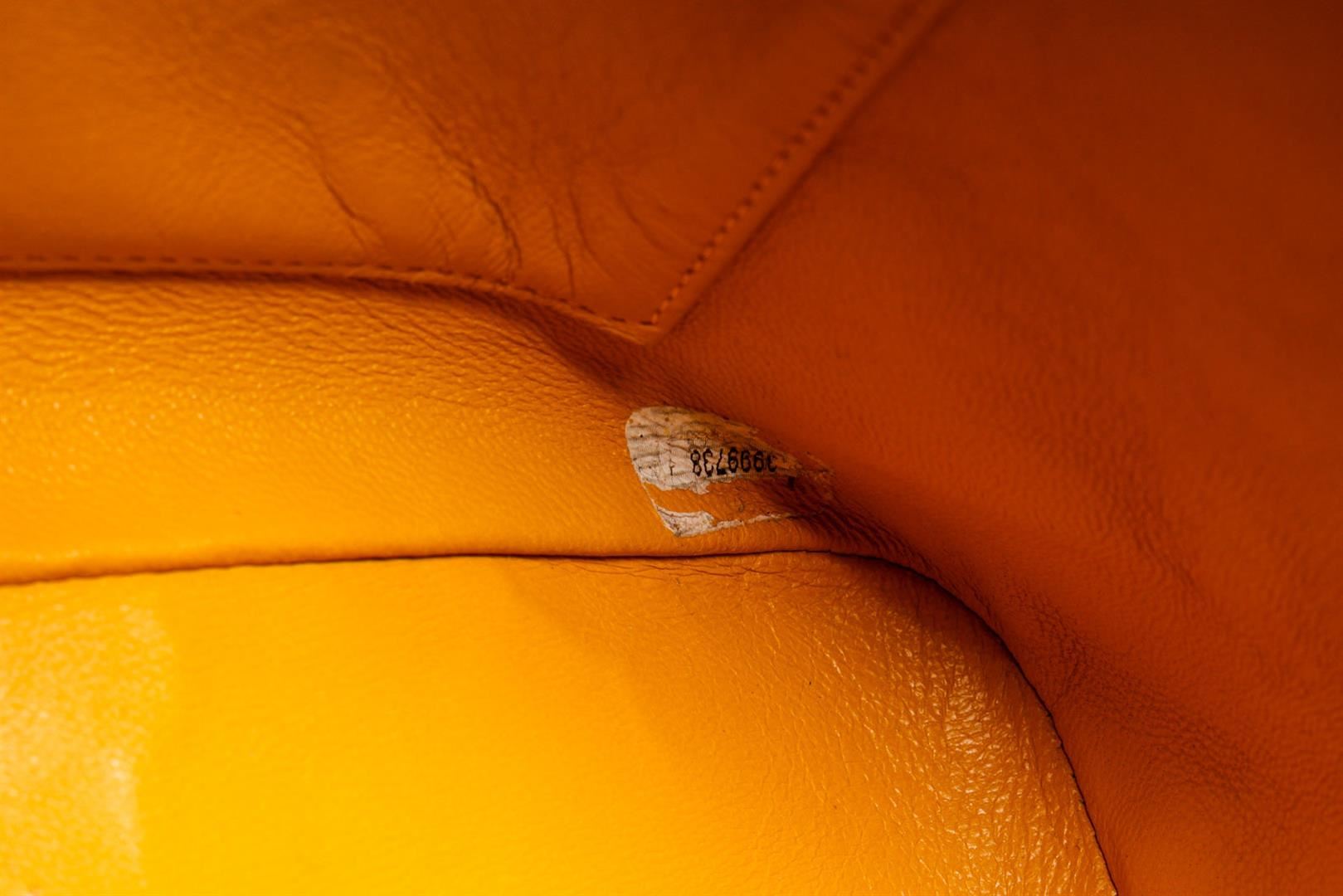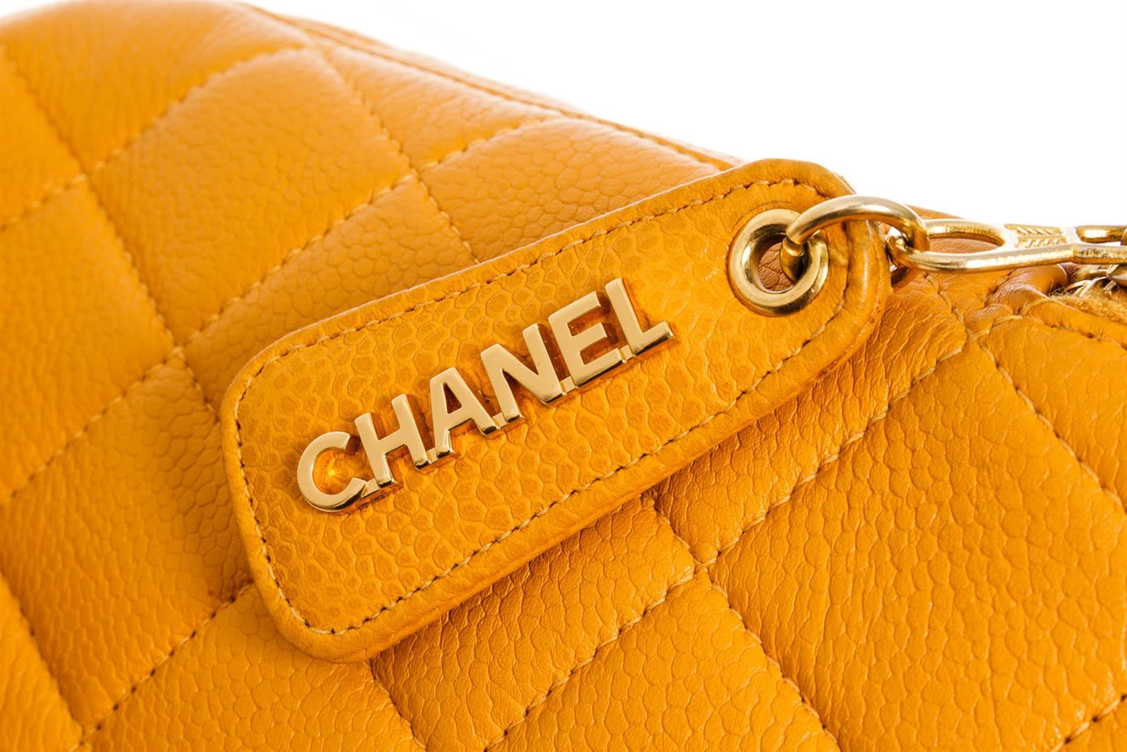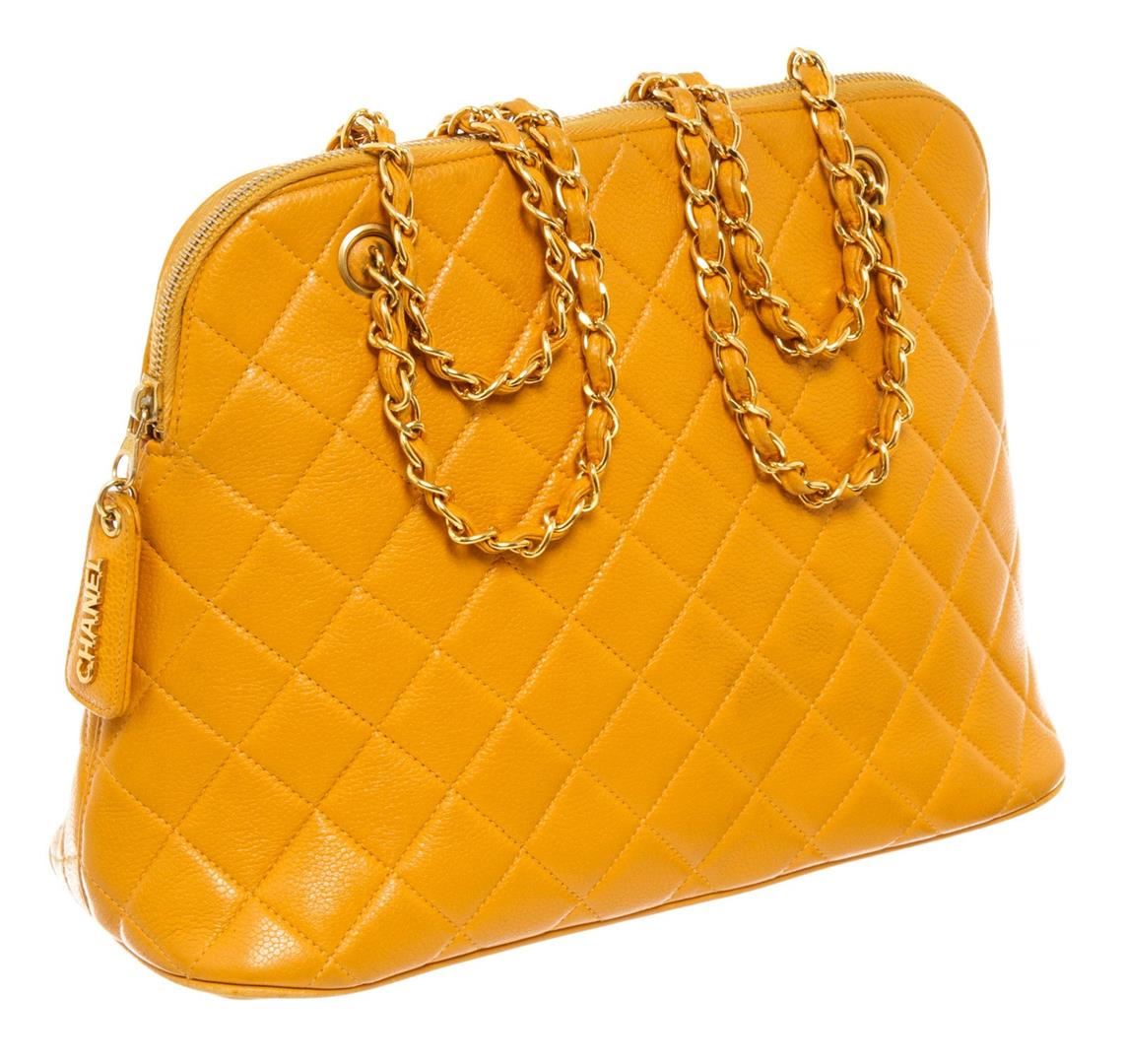 One Chanel Vintage Yellow Caviarskin Leather Matelasse Chain Shoulder Bag. Item is sold AS-IS. All available information is listed in the description and shown in the photo. Chanel Matelasse Shoulder Bag in yellow quilted Caviar leather and has gold-tone hardware. It has a unique rounded top shape with a wrap-around zipper closure. The zipper has a stylish zipper tag with "CHANEL" in large gold letters. The bottom has a large CC logo stitched and embossed on. The inside is lined with yellow lambskin leather and has one zipper and one slip pocket. 11.4" x 4.3" x 8.7"