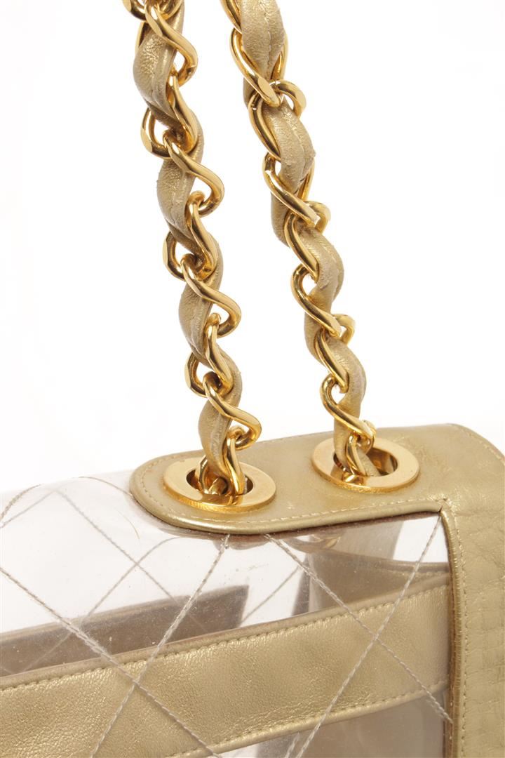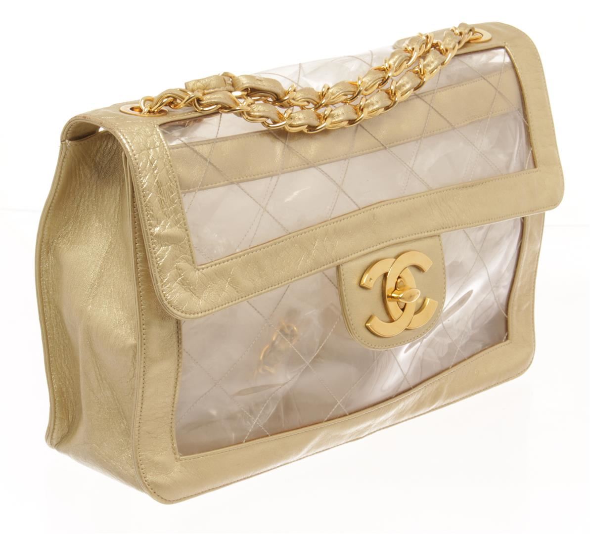 Chanel Vinyl Gold Lambskin Flap Maxi Shoulder Bag. All available information is listed in the description and shown in the photos. Chanel Vinyl Gold Lambskin Flap Maxi Shoulder Bag with leather and chain-link shoulder strap, interlocking cc turn-lock fastening, main compartment, slip pocket to the rear, gold-tone hardware. Depth 3.9 in, Height 9.1 in, Strap 13 in, Width 13.2 in / Depth 10 cm, Height 23 cm, Strap 33 cm, Width 33.5 cm