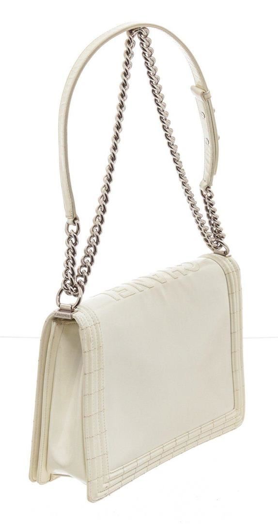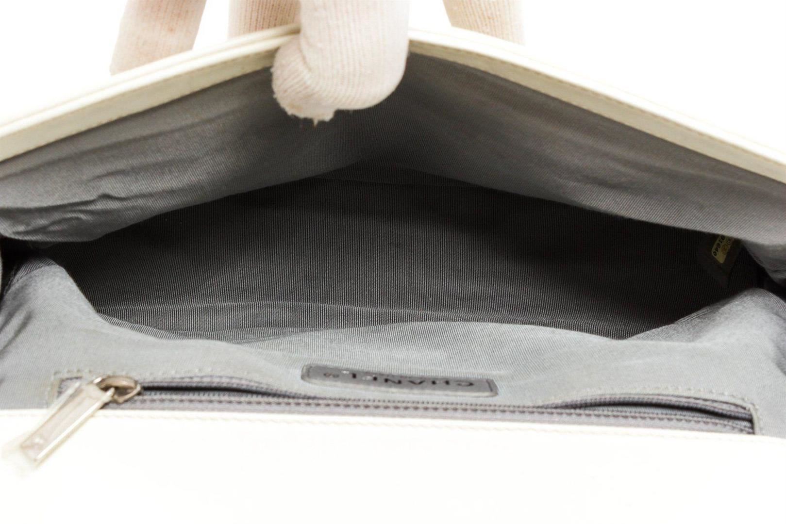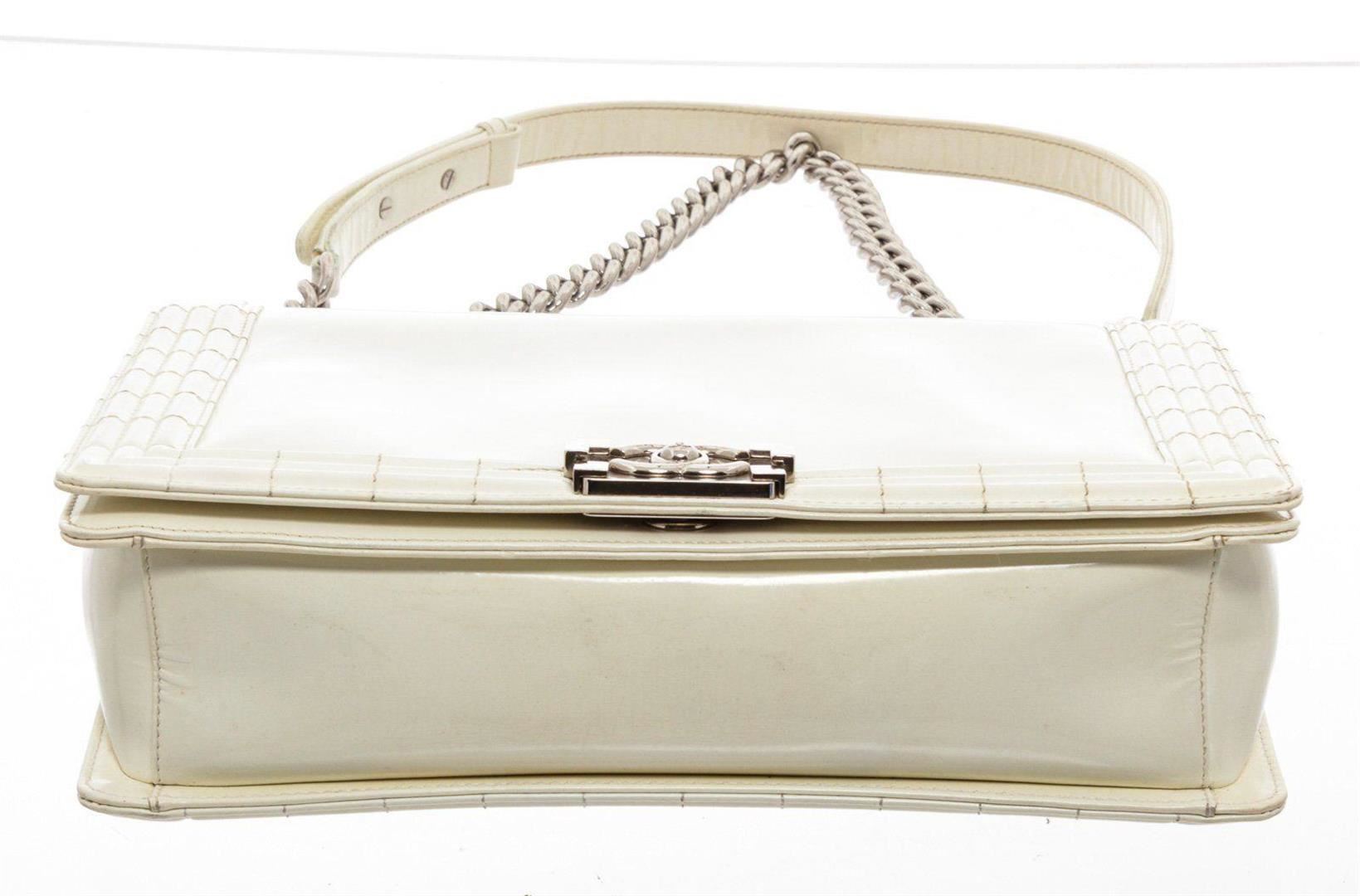 Chanel White Patent Leather Large Boy Bag with patent leather, white-tone hardware, white leather trim, interior zip pockets, white patent lining, dual top handles, chain-link shoulder straps Measurements: Length: 12 in / 30 cm Width: 3.5 in / 9 cm 7.5 in / 19 cm Condition: Pre-Owned Good overall Condition. Please refer to photographs.