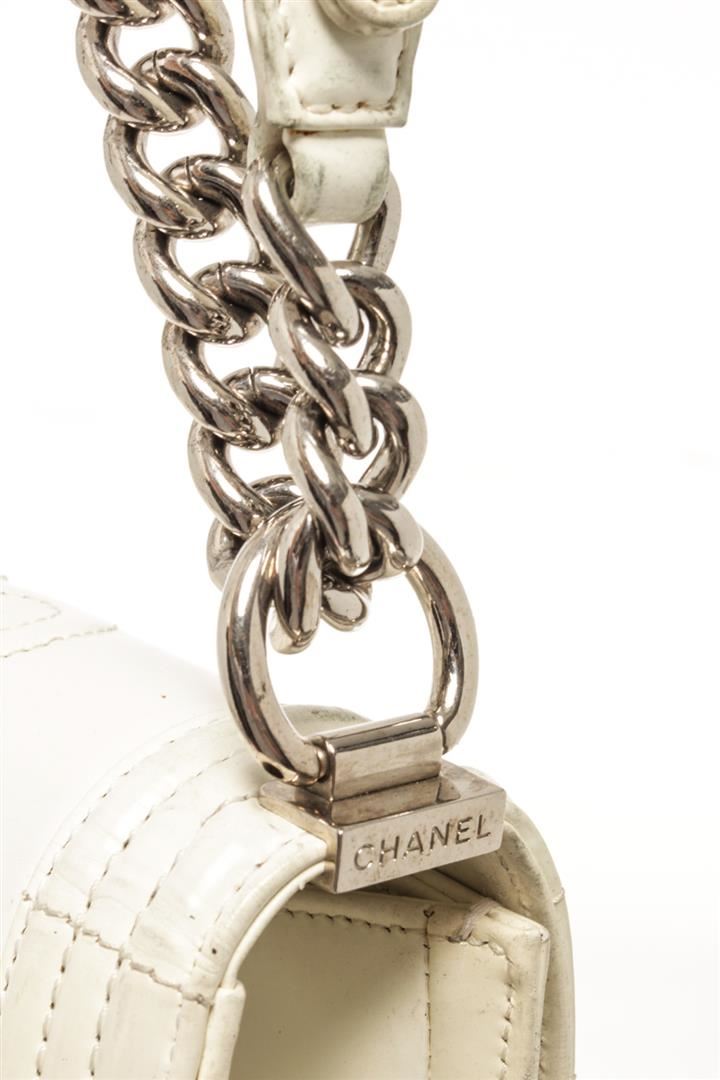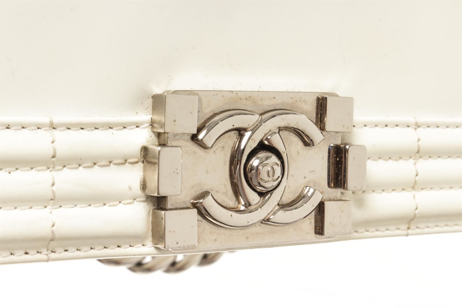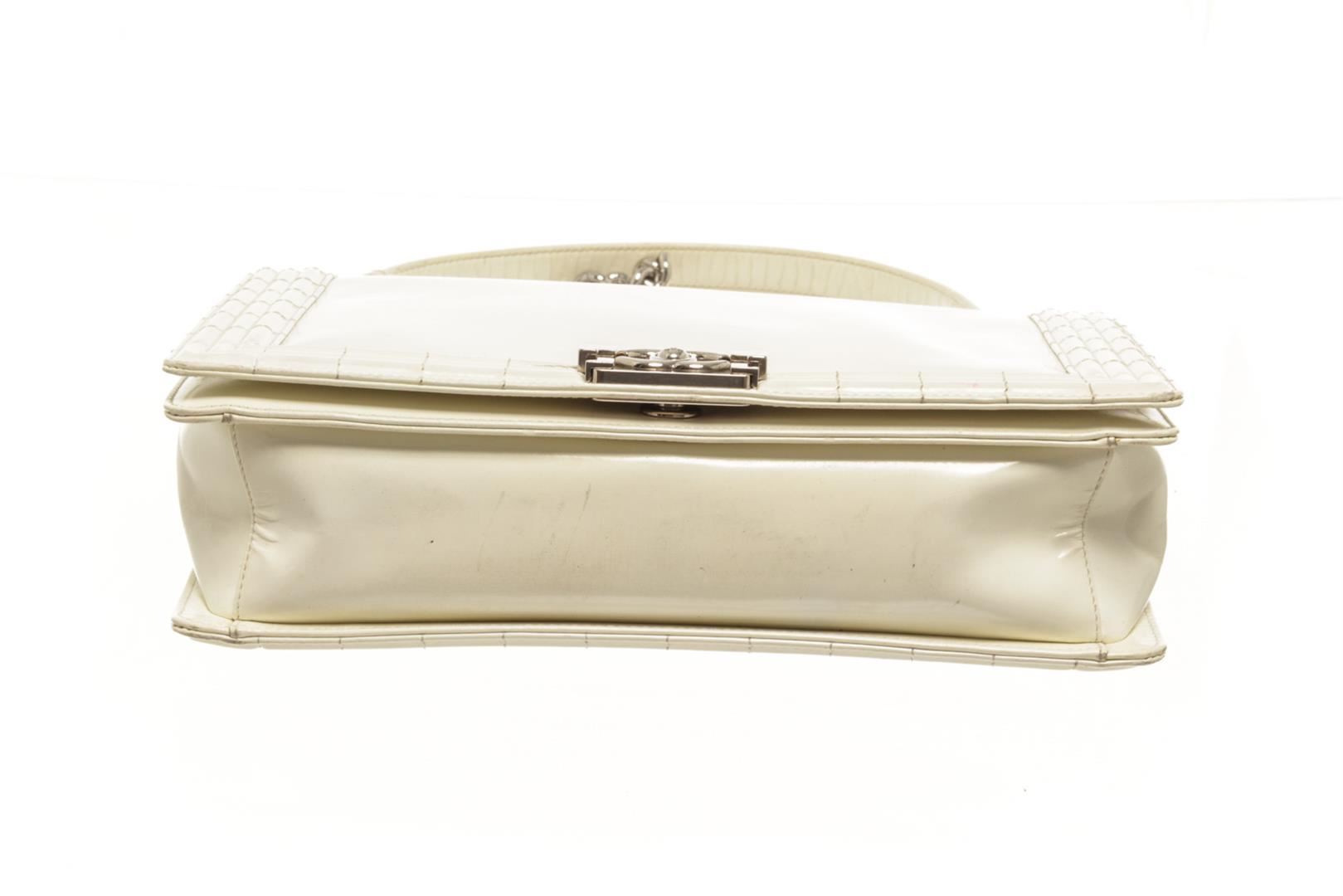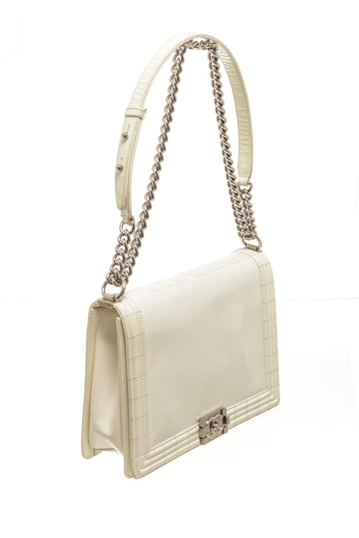 Chanel White Patent Leather Large Boy Shoulder Bag. All available information is listed in the description and shown in the photos. chanel white patent leather large boy bag with patent leather, white-tone hardware, white leather trim, interior zip pockets, white patent lining, dual top handles, chain-link shoulder straps. PLEASE NOTE: Creasing found at base of bay. Height: 12 in (30.48 cm), Width: 3.5 in (8.89 cm), Depth: 7.5 in (19.05 cm)