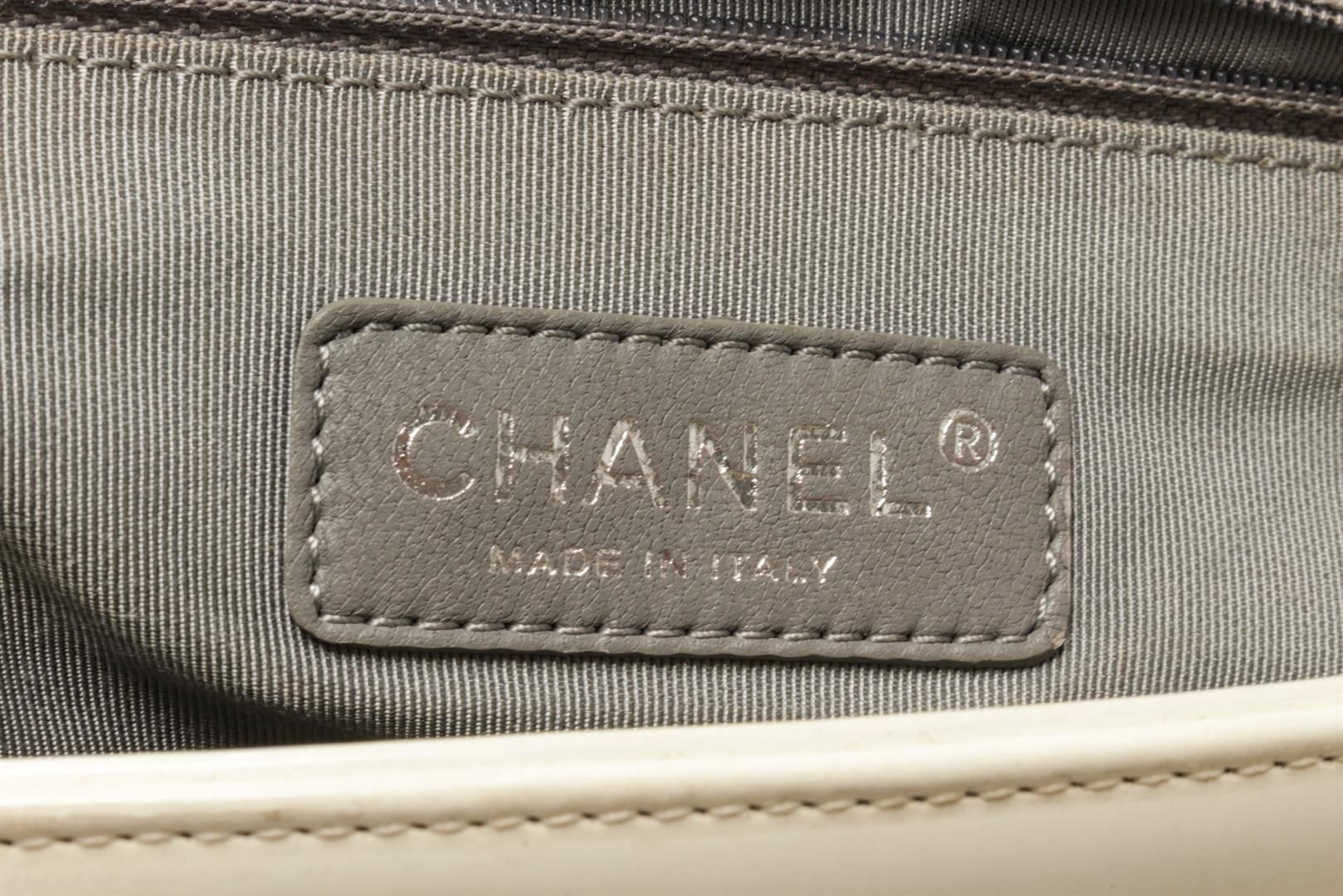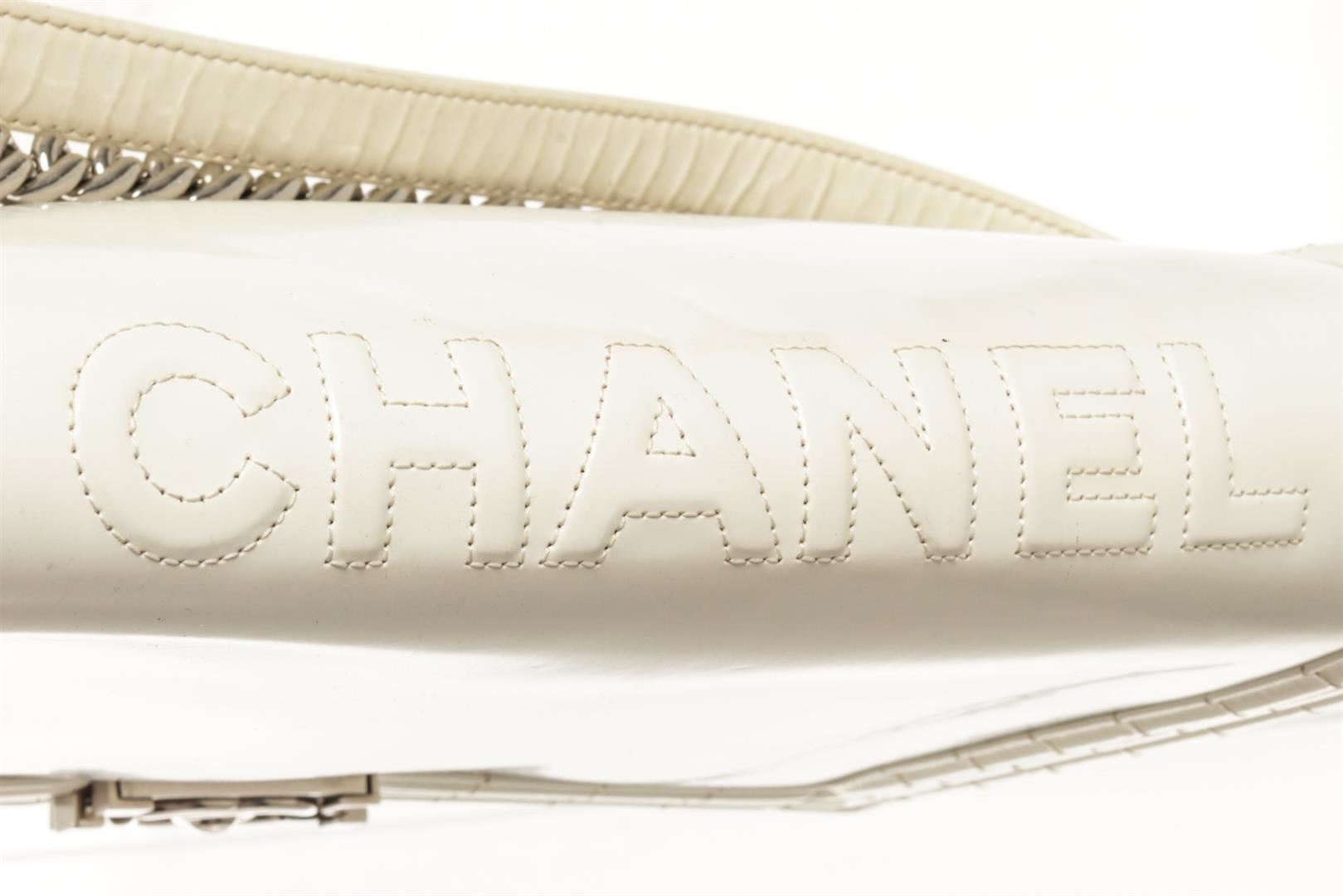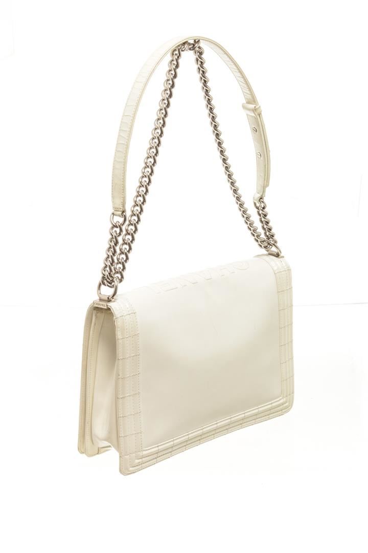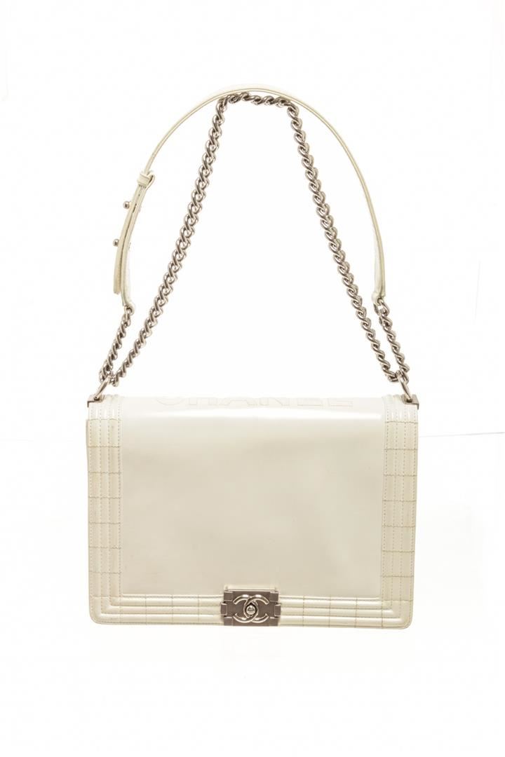 Chanel White Patent Leather Large Boy Shoulder Bag. All available information is listed in the description and shown in the photos. chanel white patent leather large boy bag with patent leather, white-tone hardware, white leather trim, interior zip pockets, white patent lining, dual top handles, chain-link shoulder straps. PLEASE NOTE: Creasing found at base of bay. Height: 12 in (30.48 cm), Width: 3.5 in (8.89 cm), Depth: 7.5 in (19.05 cm)