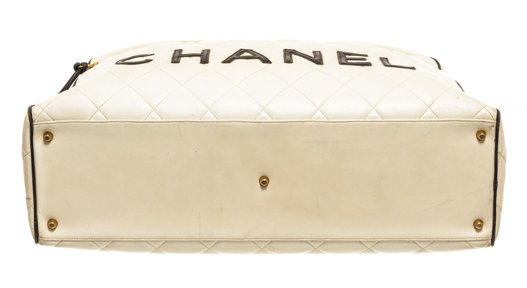 Chanel White Quilted Bowling Bag. All available information is listed in the description and shown in the photos. Chanel White Quilted Bowling Bag features gold-tone hardware, black leather lining and trim, zip pocket on the interior and exterior, with two white leather top handles and top zip closure.