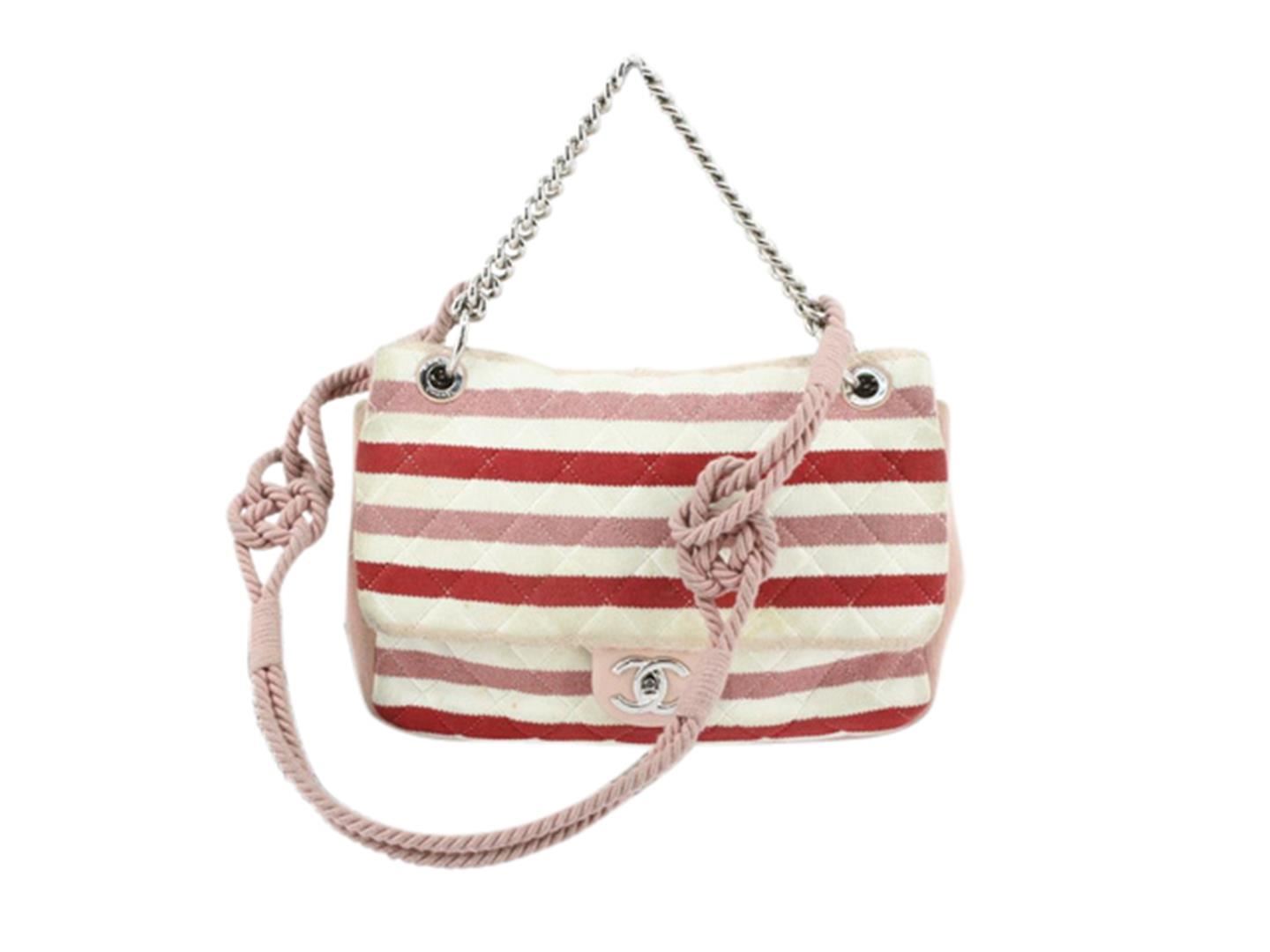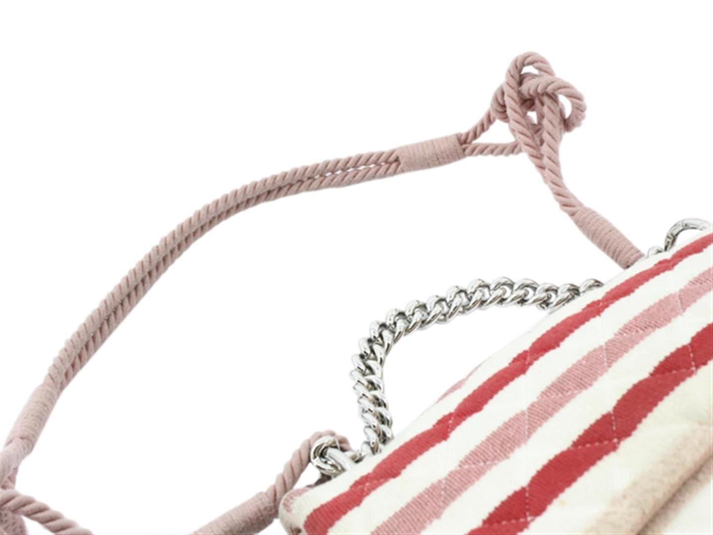 One Chanel White Red Quilted Jersey Flap 2Way Bag. Item is sold AS-IS. All available information is listed in the description and shown in the photo. Chanel White Red Quilted Jersey Flap 2Way Bag with silver-tone hardware, pink jersey trim, blue fabric lining, one interior zip pocket, straps & handle, and CC turn-lock.