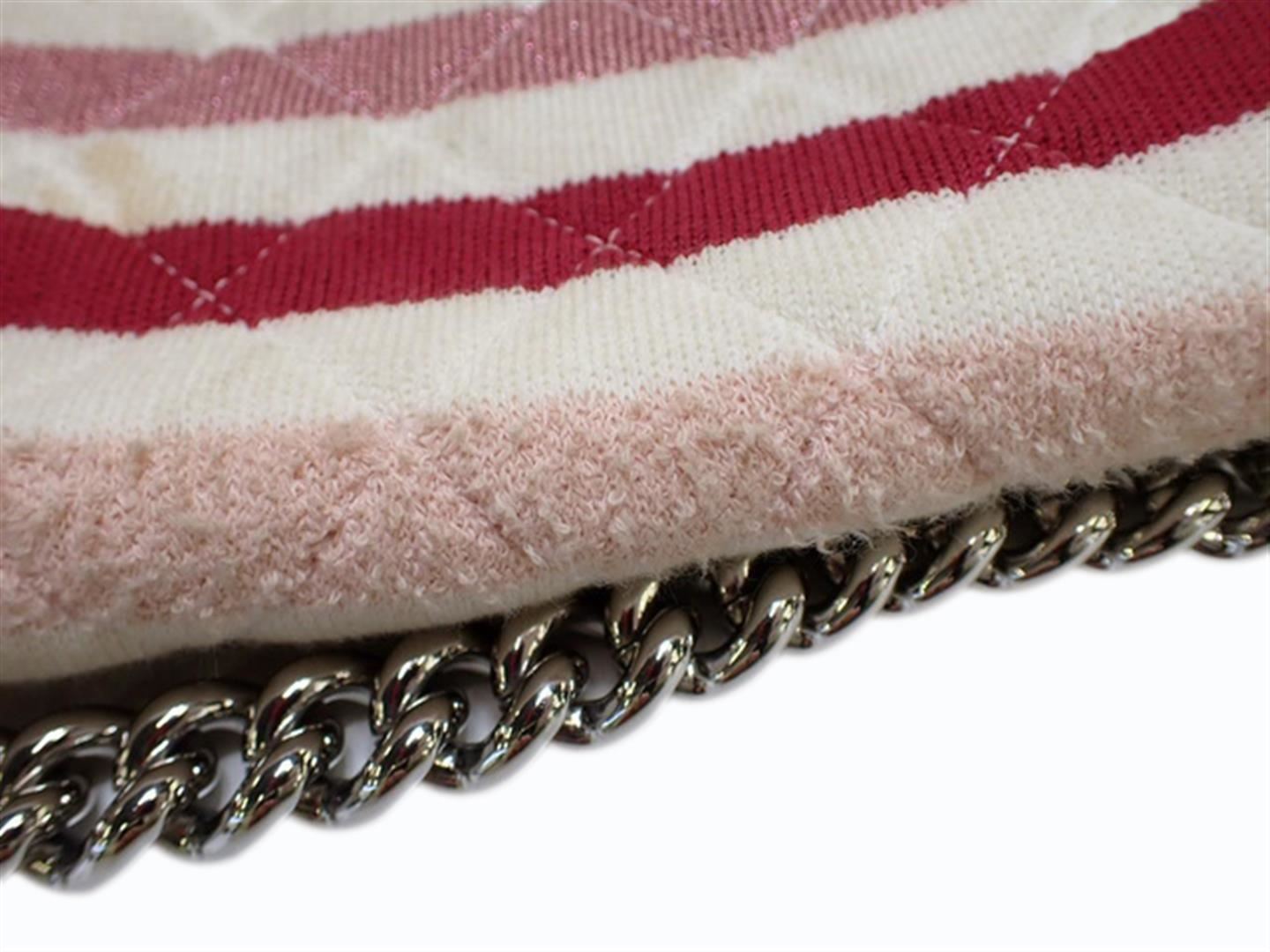 One Chanel White Red Quilted Jersey Flap 2Way Bag. Item is sold AS-IS. All available information is listed in the description and shown in the photo. Chanel White Red Quilted Jersey Flap 2Way Bag with silver-tone hardware, pink jersey trim, blue fabric lining, one interior zip pocket, straps & handle, and CC turn-lock.