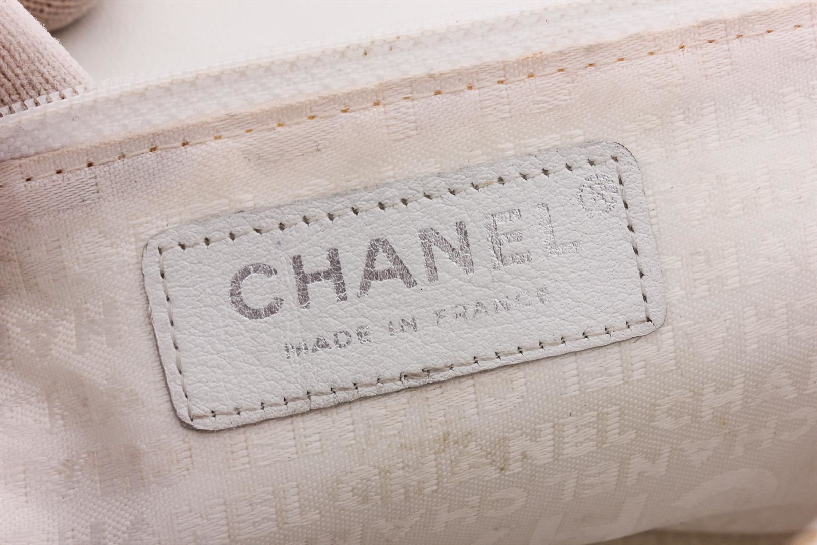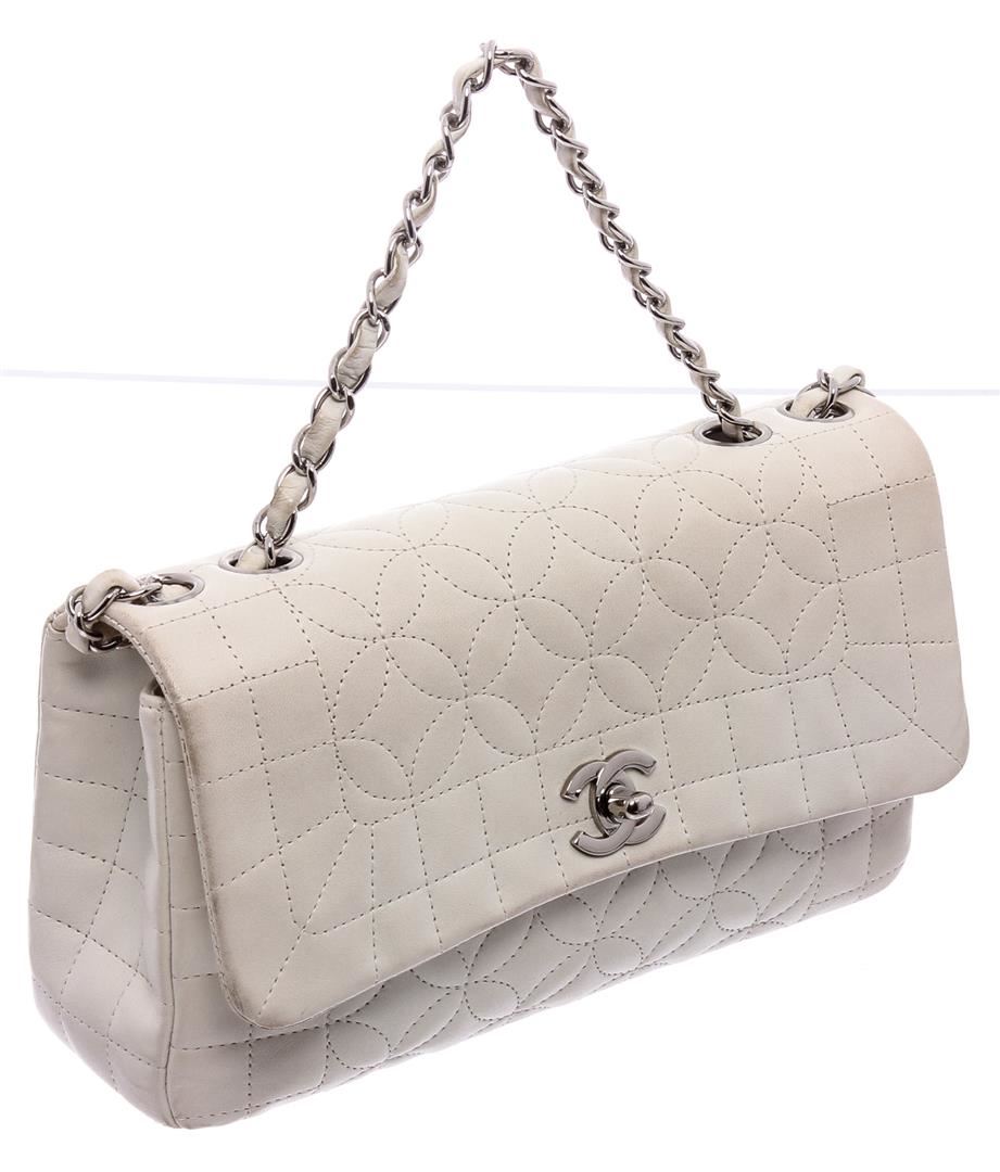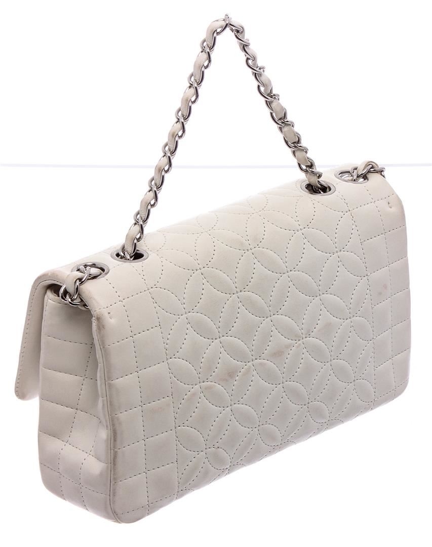 White stitched leather Chanel single flap bag with silver-tone hardware, single chain-link and leather shoulder strap, tonal jacquard logo lining, dual interior pockets; one with zipper closure and overall flap with CC turn-lock closure.