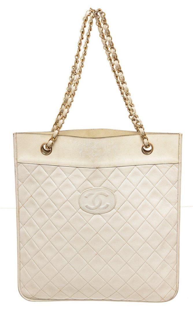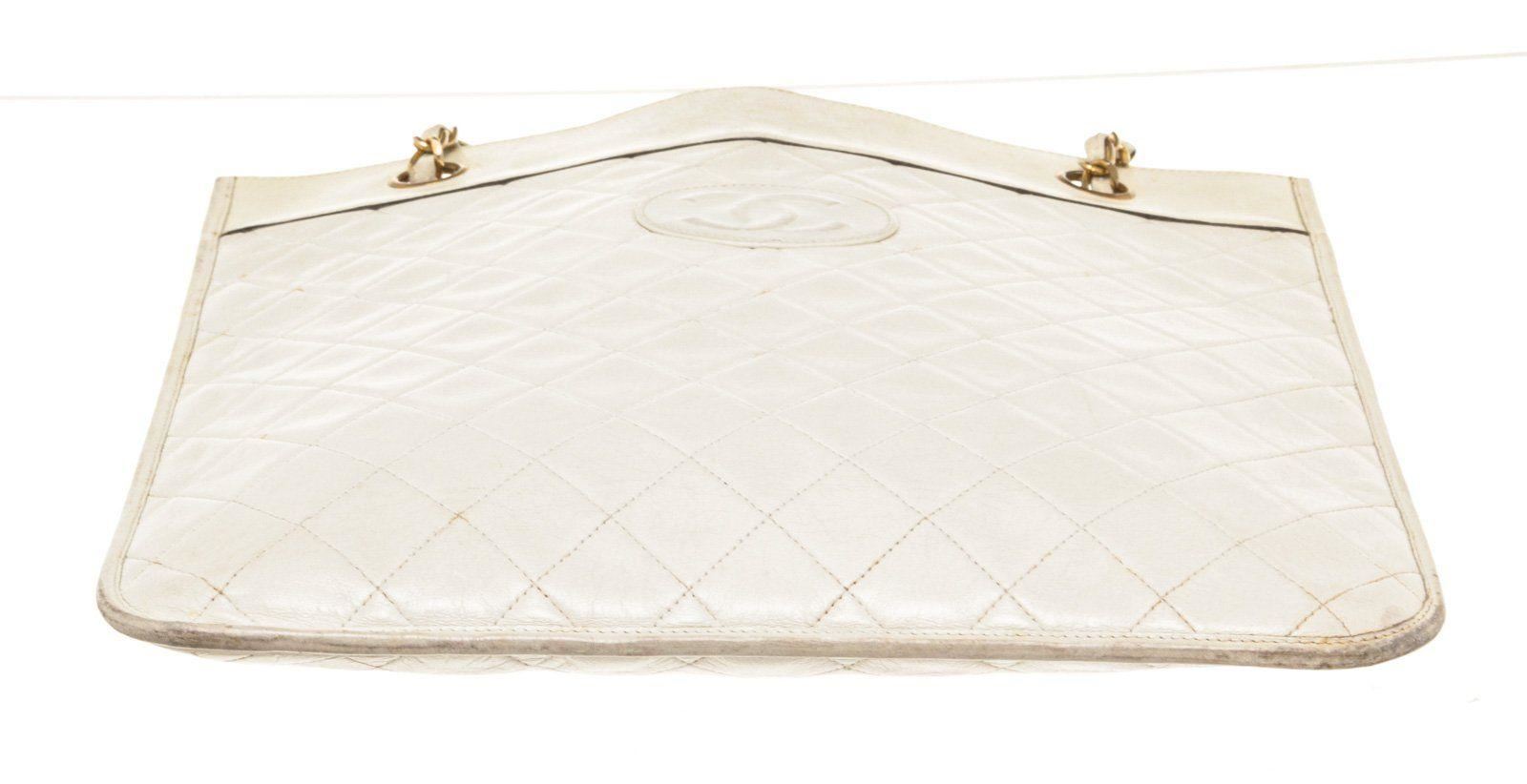 Chanel White Vintage CC Flat Chain Shoulder Bag. All available information is listed in the description and shown in the photos. Chanel White Vintage CC Flat Chain Shoulder Bag with material leather, gold-tone hardware, interior slip pocket, and chain shoulder strap. Please note: vintage condition, leather is dry.