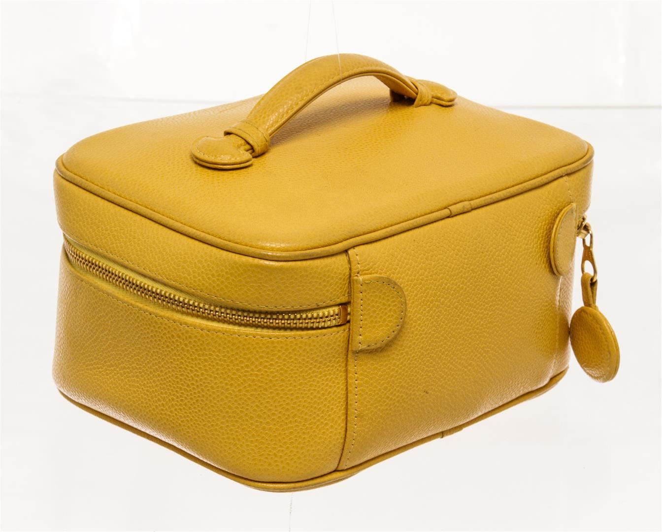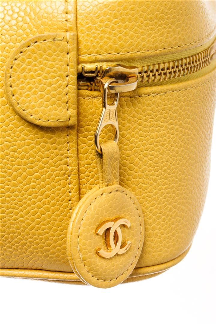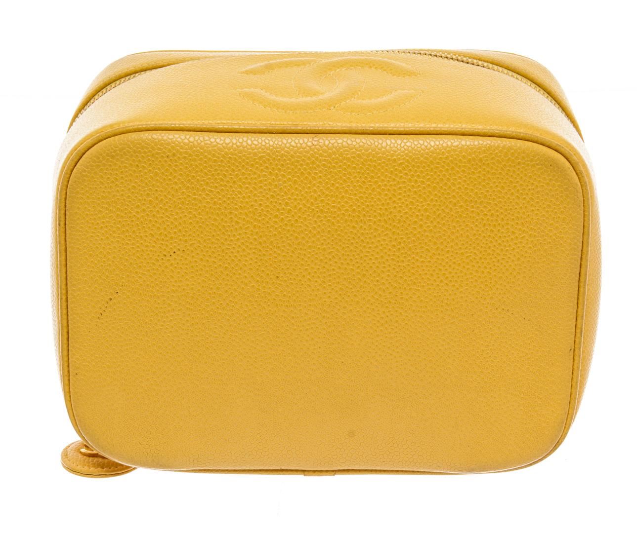 Chanel Yellow Caviar Leather Small CC Vanity Cosmetic Bag. All available information is listed in the description and shown in the photos. Chanel Yellow Caviar Leather Small CC Vanity Cosmetic Bag with featuring a top handle, an all around zip fastening, a front embossed logo stamp, gold-tone hardware, an internal mirror, an internal logo patch and a white lining. Height: 2.8" Width: 5.9" Depth: 3.1", Handle Drop: 0.6" / 7 x 15 x 8 Cm