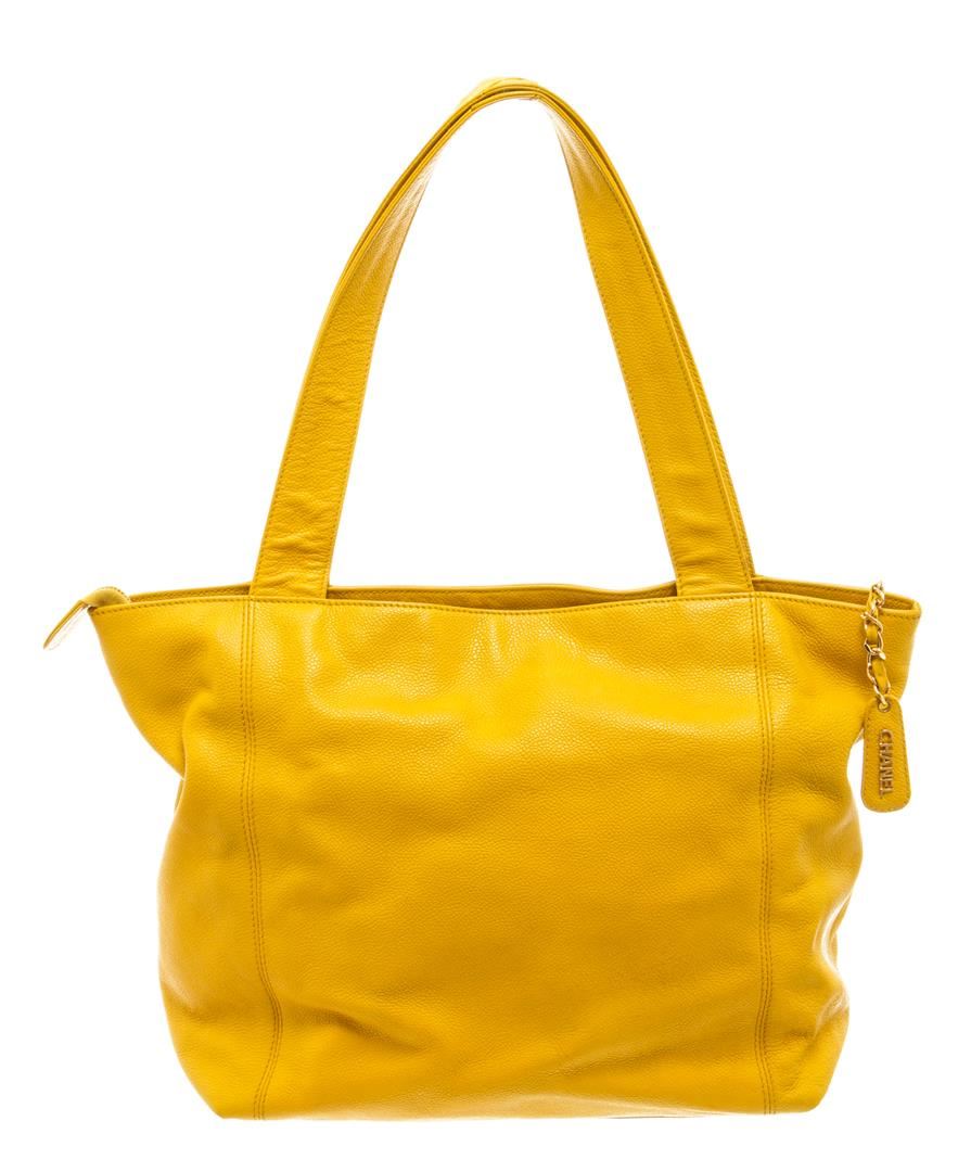 One Chanel Yellow Leather Vintage CC Shoulder Bag. Item is sold AS-IS. All available information is listed in the description and shown in the photo. Chanel yellow leather vintage CC shoulder bag with yellow leather exterior with a stitched-in CC logo on the front, two top handles, yellow fabric lining, gold-tone hardware, zipper closure, Chanel logo on the exterior zipper tab, CC logo on the interior zipper tag, and one main compartment with one zip pocket. There is some wear on the zipper, stains on the canvas lining as shown in pictures.