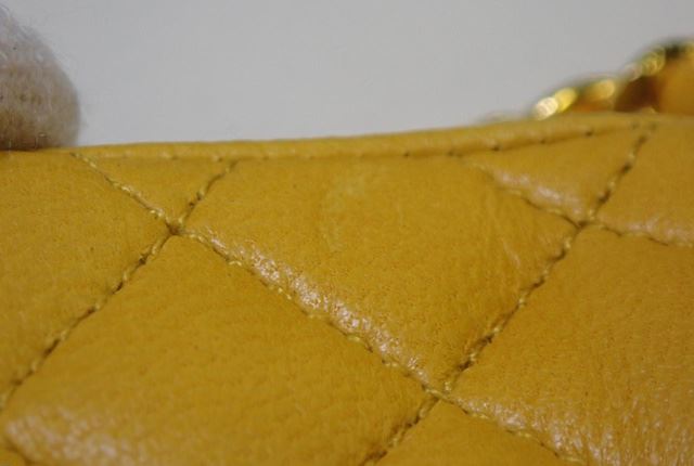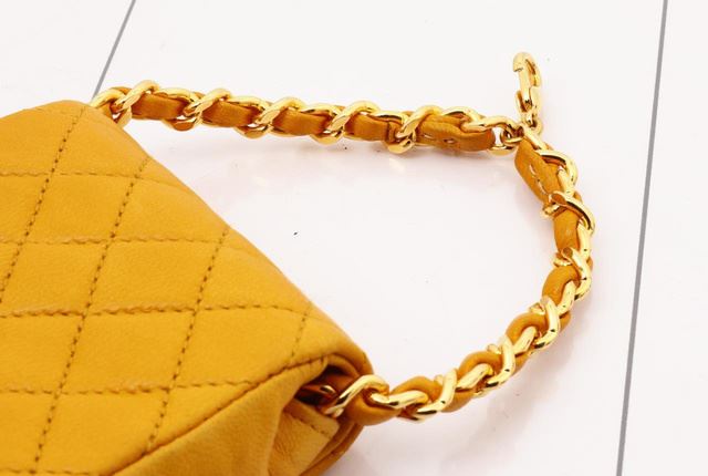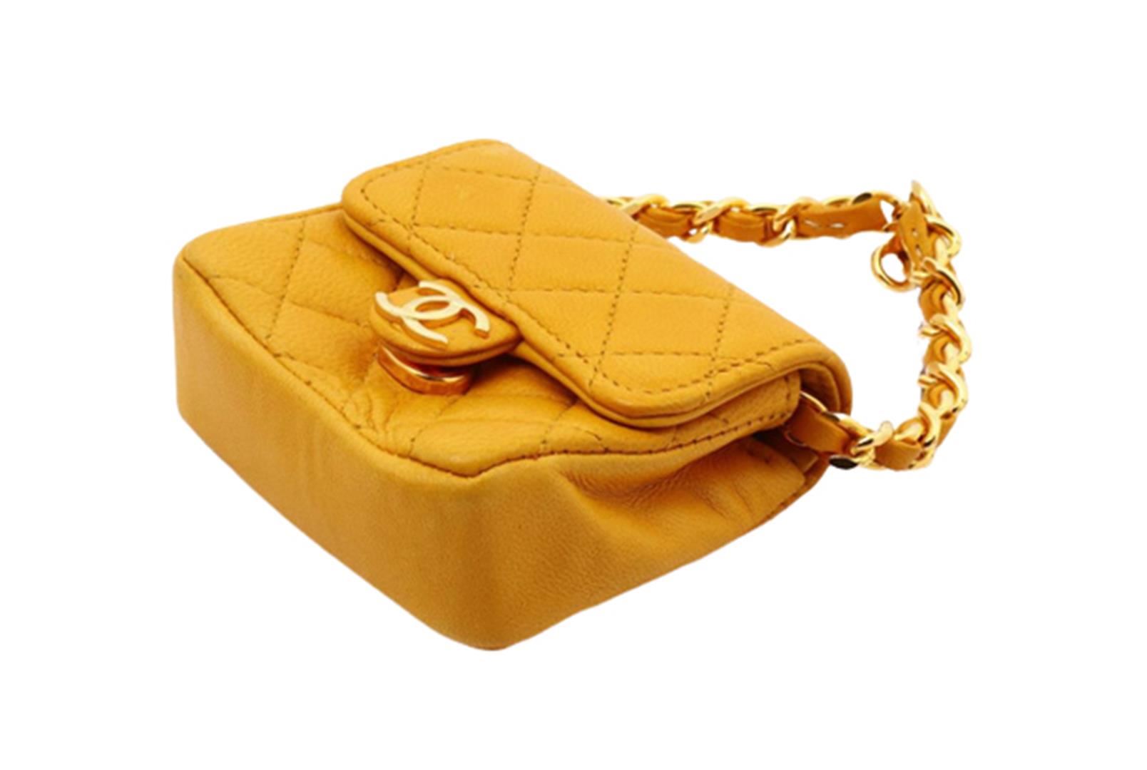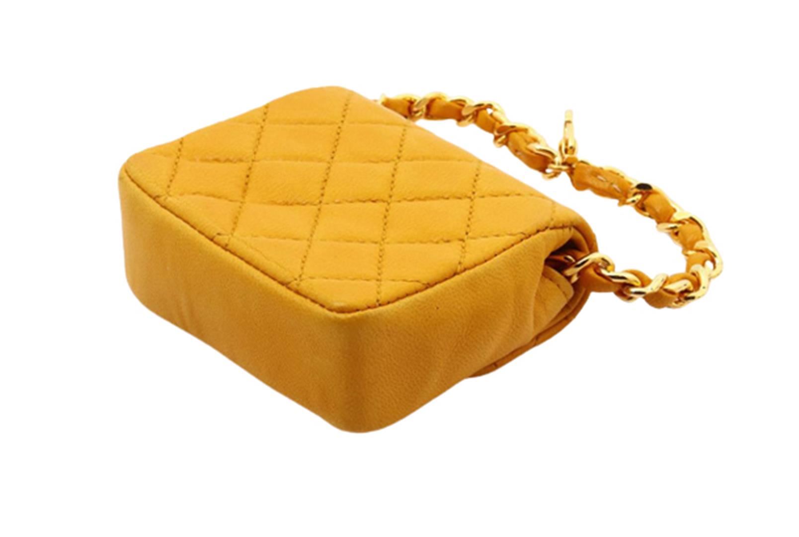 One Chanel Yellow Quilted Leather Flap Micro Flap Bag. Item is sold AS-IS. All available information is listed in the description and shown in the photo. Yellow quilted leather Chanel Micro Flap bag with gold-tone hardware, an interlocking CC logo at front flap, woven leather and chain-link strap, magnetic snap closure and yellow leather lining. 3 cm x 6 cm x 7 cm