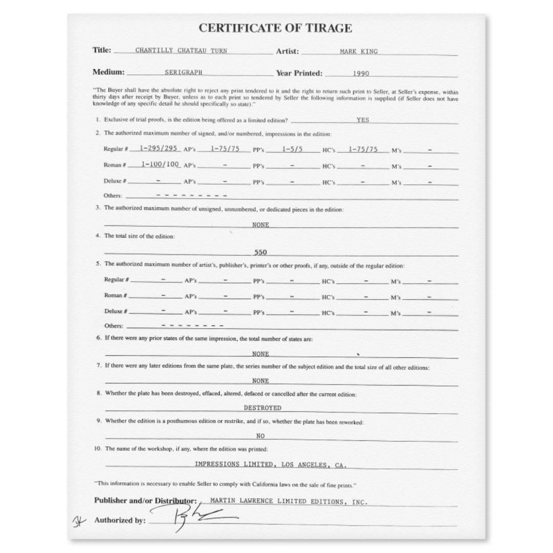 "Chantilly Chateau Turn" is a limited edition serigraph on paper by Mark King (1931-2014). Hand signed and numbered this piece comes with a letter of authenticity and measures approximately 27" x 36" (image).