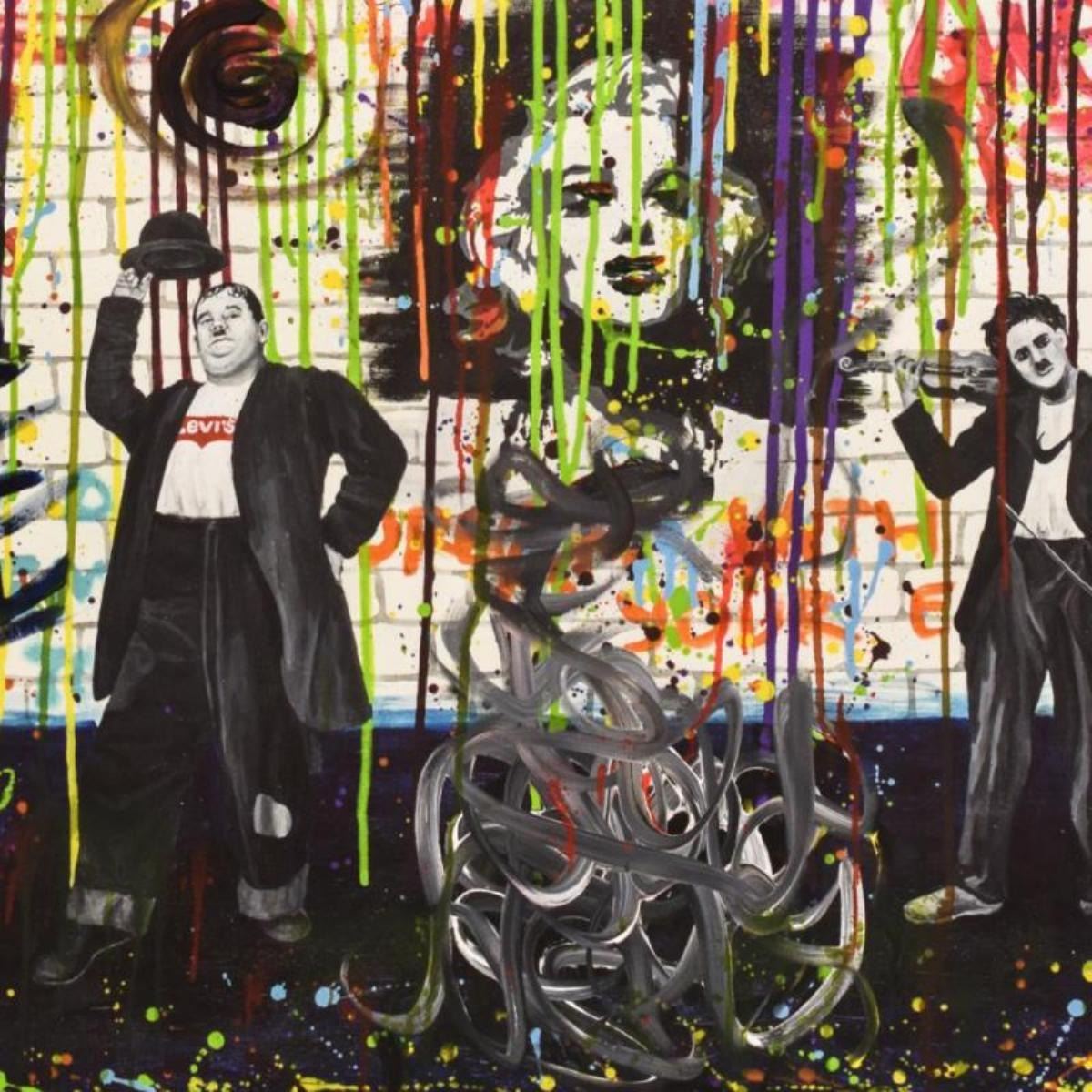 "Chaplin and Hardy" is an original Mixed Media on Canvas by Nastya Rovenskaya. The piece is hand signed and comes with a Certificate of Authenticity. Measures approximately 40" x 30".