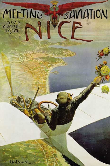 Artist: Charles Brosse - Title: Meeting Aviation - Medium: Fine Art Reproduction Giclee on Canvas - Image Size: Approximately 32 inches x 21.25 inches - Unframed on Unstretched Canvas - Charles-Léonce Brossé (born 1871), also known as Bsor or Bzor, was a French painter; engraver and lithographer. He is most well known for this poster "Meeting d'Aviation Nice," promoting an early "aviation meet" or air show held in Nice, France, April 10-25, 1910. The poster depicts a pilot scattering roses from his airplane flying high over the Nice coast. Notice the shape of the left wing is mirrored in the shape of the water above and below the right wing. The lettering at the top is in a distinct Art Nouveau style and surrounds a crowned red eagle, representing the arms of Nice, with exaggerated wings extending far beyond the shield and resembling the wings of an airplane.