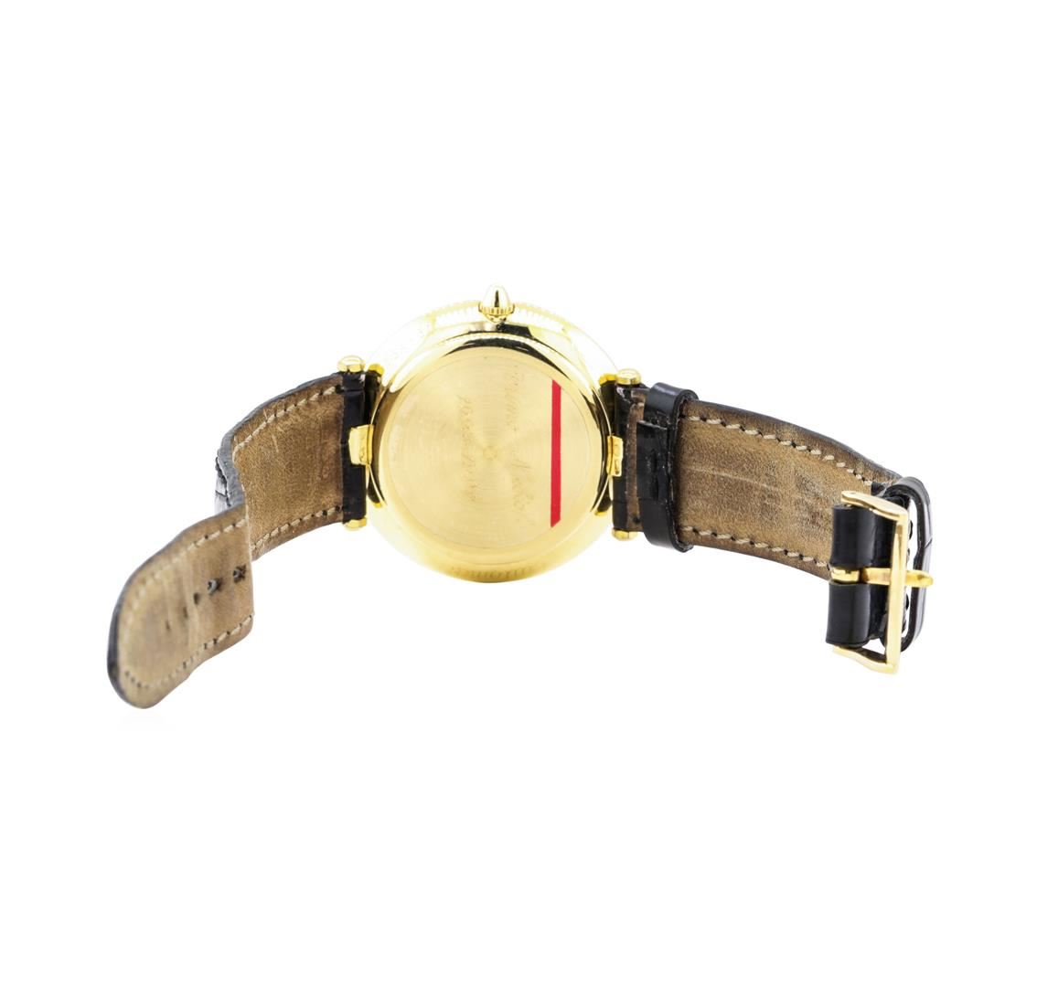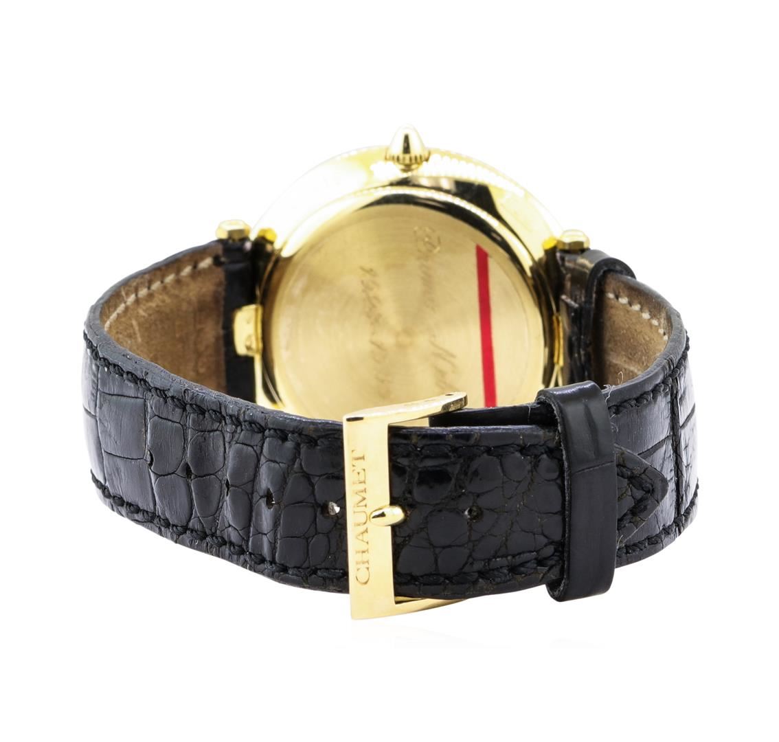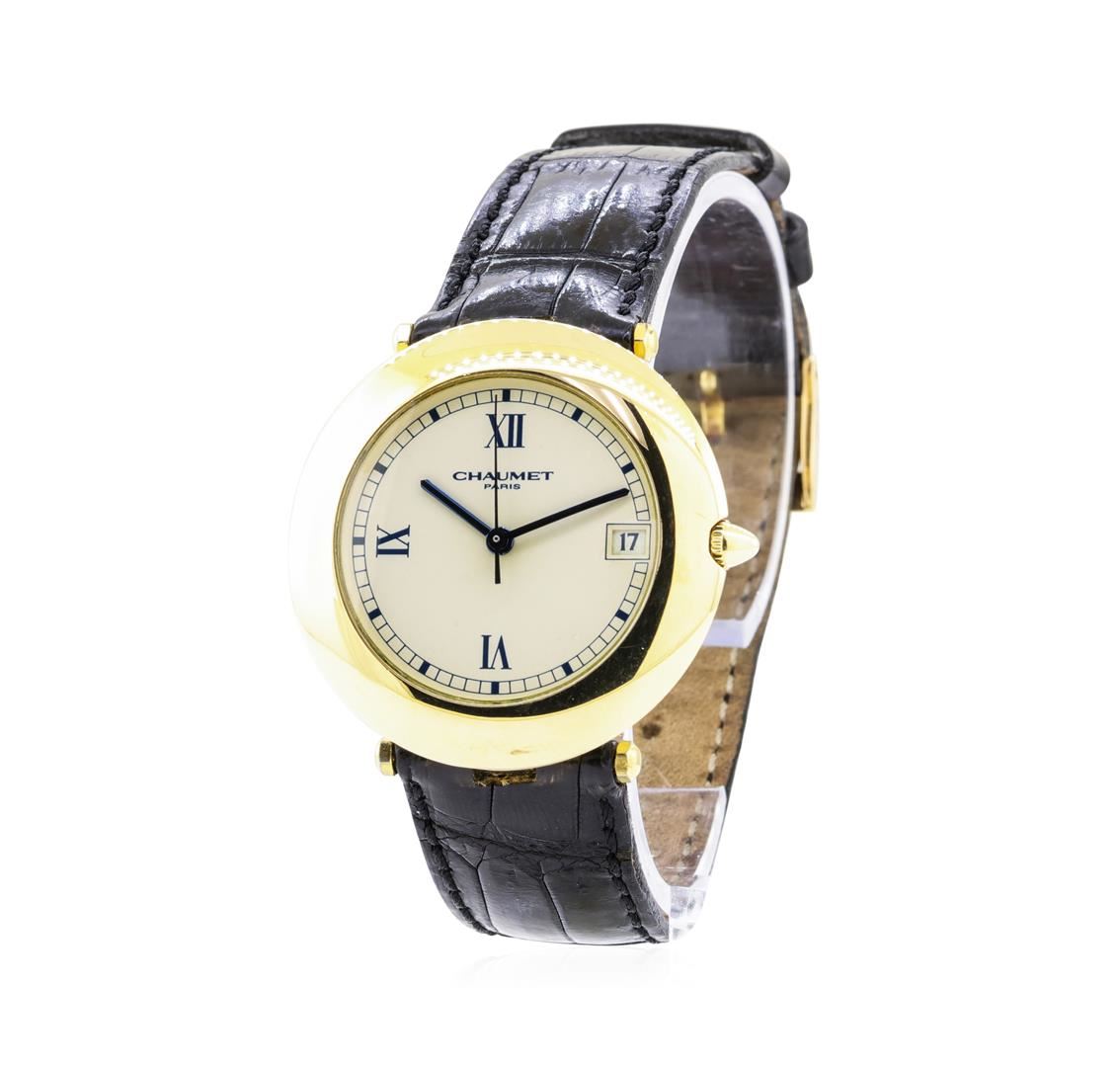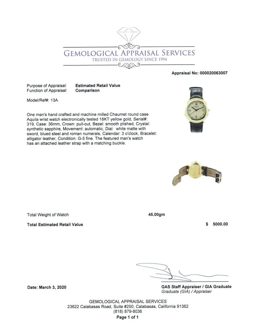One man's, hand crafted and machine milled Chaumet round case Aquila wrist watch electronically tested 18KT yellow gold, Serial#: 319, Case: 36mm, Crown: pull-out, Bezel: smooth plished, Crystal: synthetic sapphire, Movement: automatic, Dial: white matte with sword, blued steel and roman numerals, Calendar: 3 o'clock, Bracelet: alligator leather, Condition: G-5 fine. The featured man's watch has an attached leather strap with a matching buckle.. Total Weight of Watch 45.00gm GAS Appraised at $5000.00. GAS Appraised.