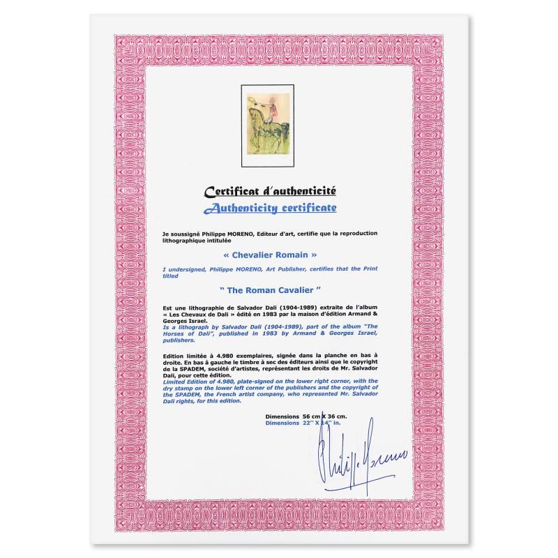 Chevalier Romain (The Roman Cavalier) is a limited edition lithograph by Salvador Dali (1904-1989), bearing the plate signature of the artist. This piece was published by Armand & Georges Israel in 1983 during Dalis lifetime and under his supervision. This piece was printed on Velin Darches paper in Paris. This work is referenced in The Official Catalog of the Graphic Works of Salvador Dali (Albert Fields). This piece comes custom framed. Includes Certificate of Authenticity. Measures approx. 20 x 28 (frame), 14 x 22 (image).