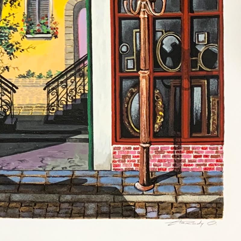 "Chez Gerard" is a limited edition serigraph on paper by Arkady Ostritsky. It is numbered and hand signed and includes a letter of authenticity. Measures approximately 36.5" x 24.5" (image).