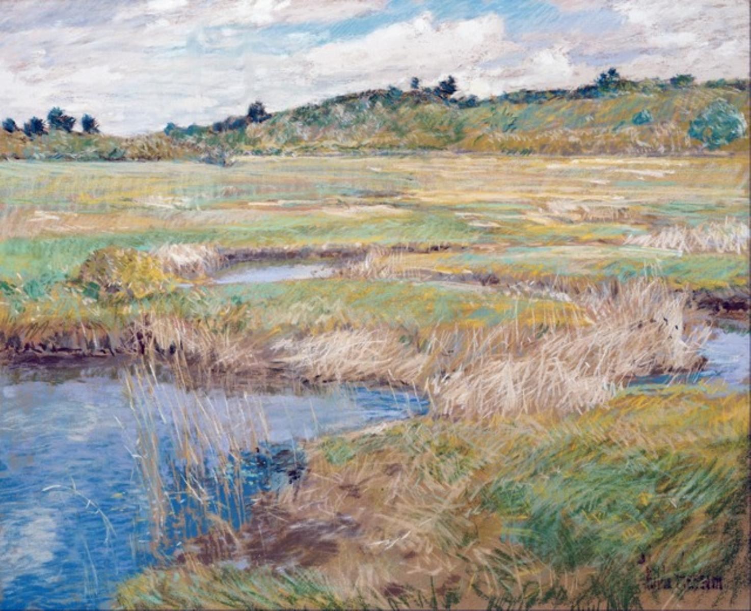 Artist: Childe Hassam - Title:The Concord Meadow - Medium: Fine Art Giclee on Canvas - Image Size: Approximately 26 inches x 32 inches - Framed: Unframed on Unstretched Canvas - Biography: Childe Hassam was a leading American impressionist painter and printmaker. The son of a prosperous hardware merchant and antique collector, Hassam (christened Frederick Childe Hassam) was born in 1859 near Boston. In 1872 a great fire in Boston destroyed his father's business, forcing Hassam to leave school. He found a job with a publishing firm, but having little talent for business, he began work as an apprentice to a wood engraver and later created illustrations for such magazines as Harper's and The Century.