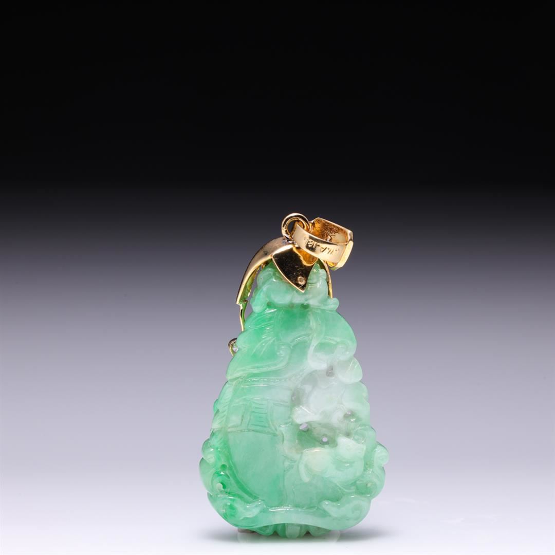 Finely carved Chinese jadeite pendant with bright green coloration mounted with 18k yellow gold and diamond "raindrops" and two diamond accents on bail, the bail stamped 18K with hallmark; gross weight 16.8 g, 2 1/8" x 1 1/8" (approx.)