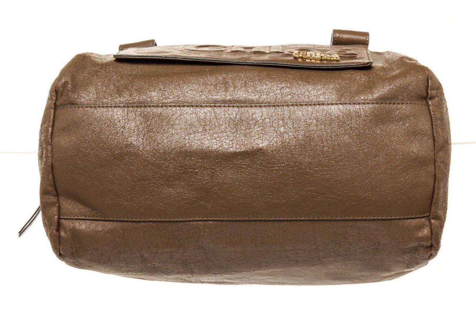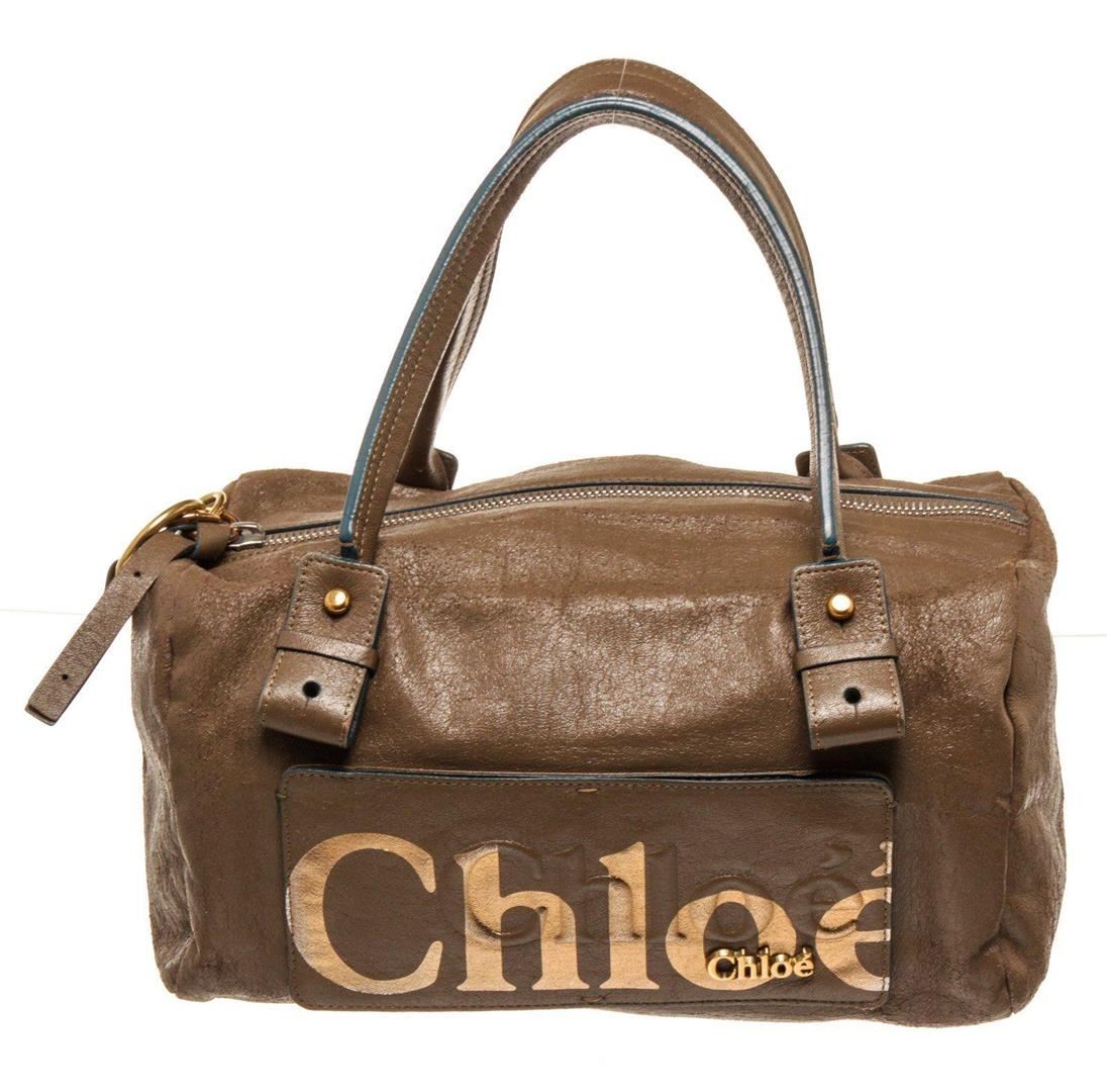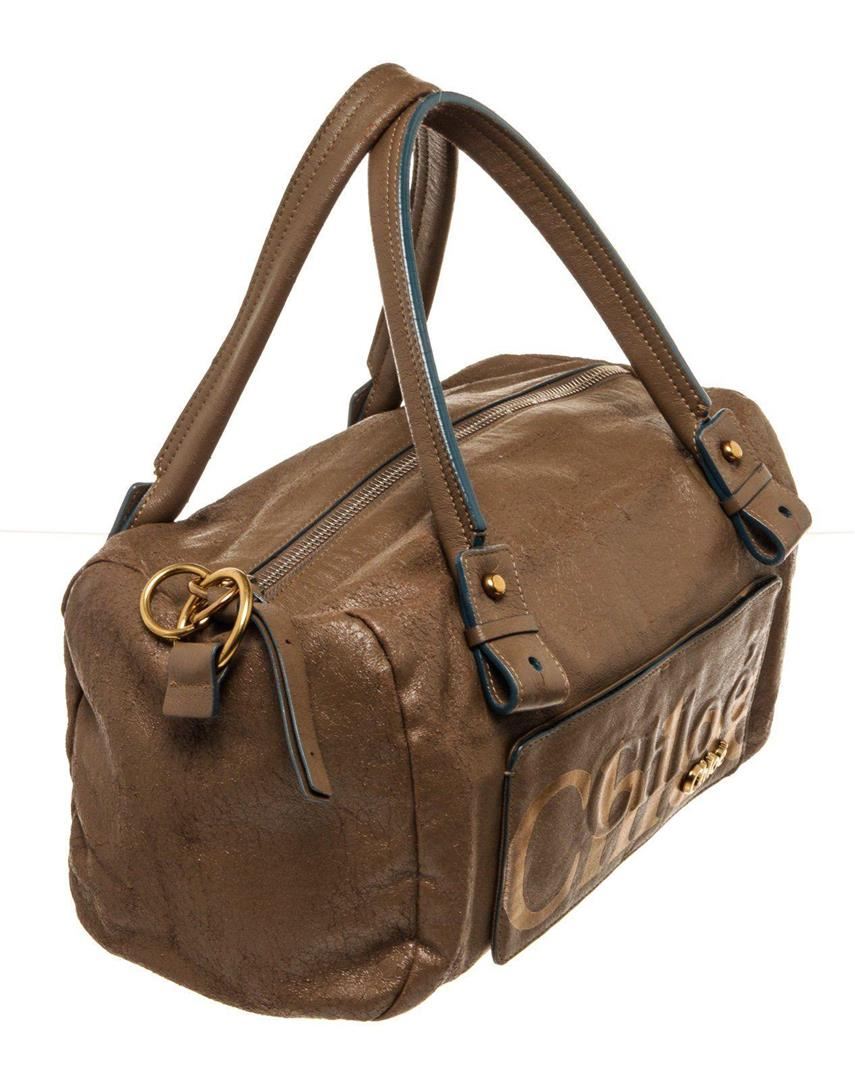 Chloe Brown Gold Leather Logo Eclipse Bost Travel Bag with material leather, gold-tone hardware, interior slip pocket, lining leather, shoulder strap and zipper closure.