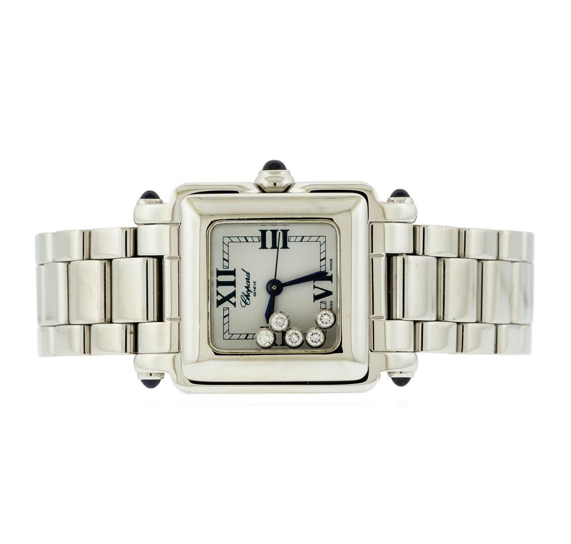 One ladies, Chopard Happy Sport Square Diamond wristwatch electronically tested Stainless Steel. Case: 31 x 23mm, Case Back: secured with four inset screws, engraved with manufactures information and ID numbers, Crown: set with a Blue cabochon crystal, Case Lugs: each lug is also set with a Blue cabochon crystal, Bezel: polished, Crystal: synthetic sapphire. The watch features five free-moving bezel set Chopard Happy Diamonds in the transparent area between the dial and the crystal. Movement: quartz, Chopard signed Dial: White, with Blue Steel pointed hands, indices and four Roman numerals, Circa: late 1990's, Chopard Bracelet: Stainless Steel links, Condition: G-6 Extra Fine. Concealed Chopard deployment clasp, with logo. Bright polish finish. Six and one half inch length. Total Weight of Watch 70.92gm. AIG Appraised at $7,050.00.