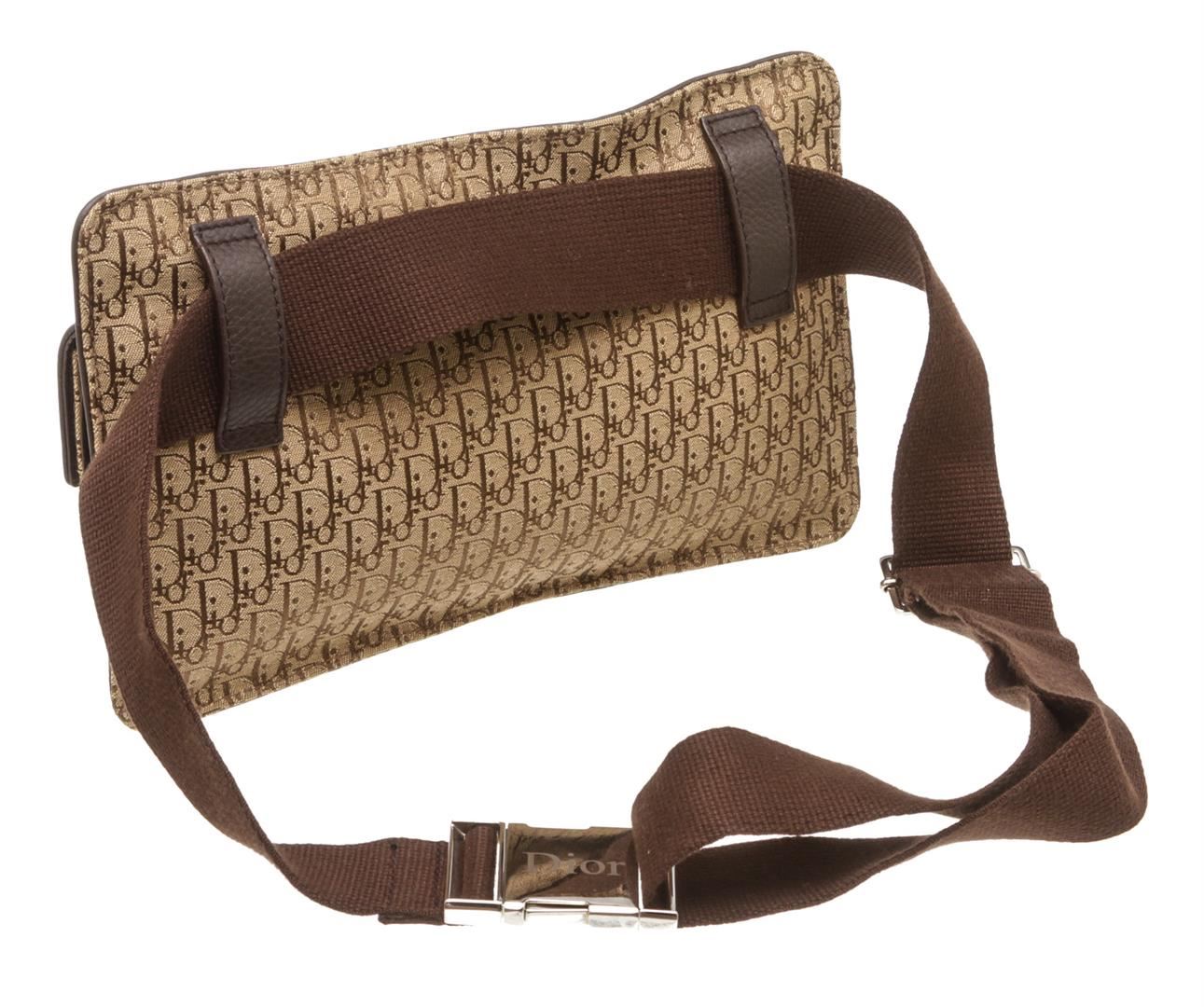 Chic Dior belt bag rendered in brown Trotter logo canvas, accented with silver-tone logo hardware and featuring three exterior compartments. Adjustable brown canvas waist strap, buckle closure on belt, zip and snap closures on compartments and nylon lining.