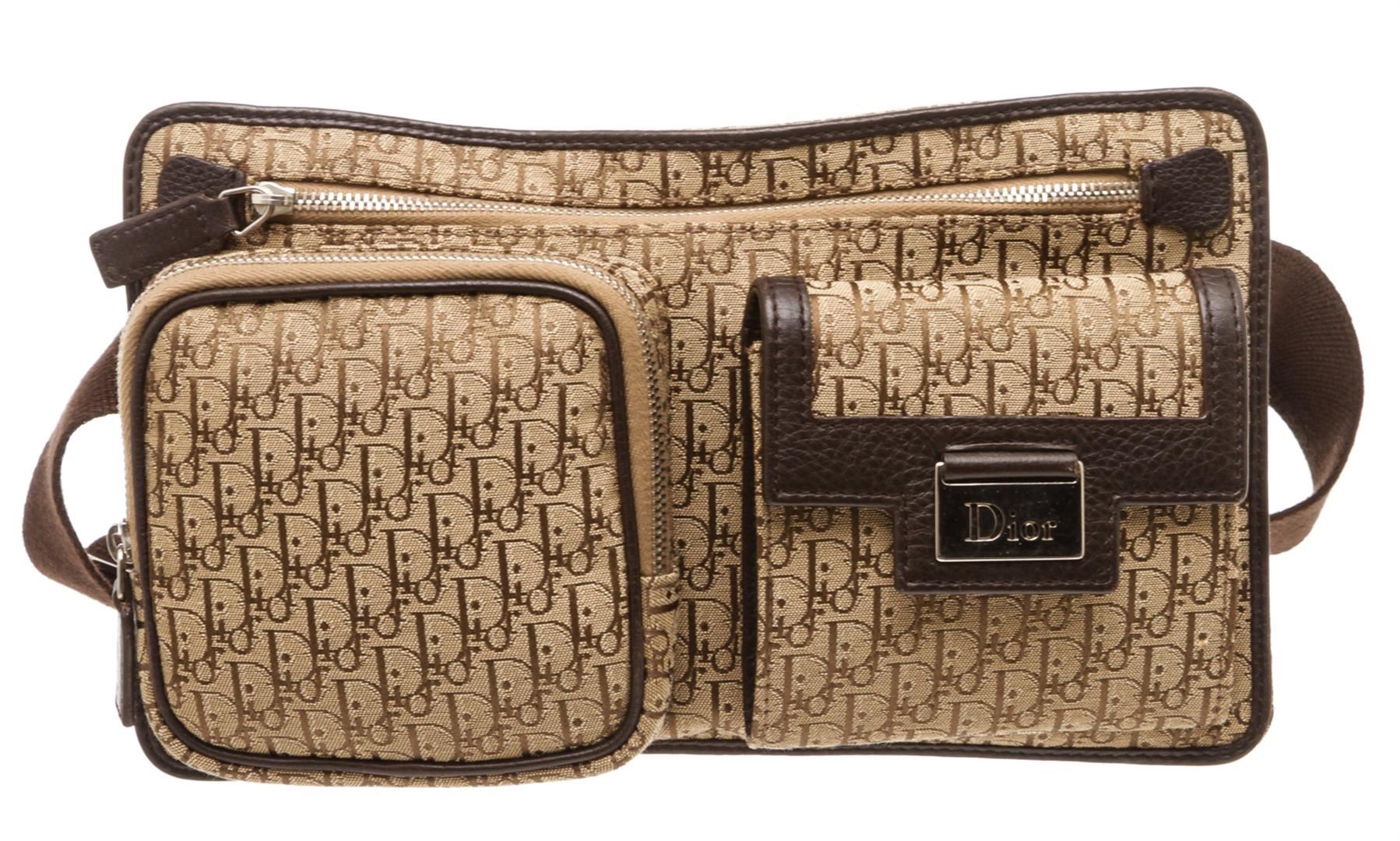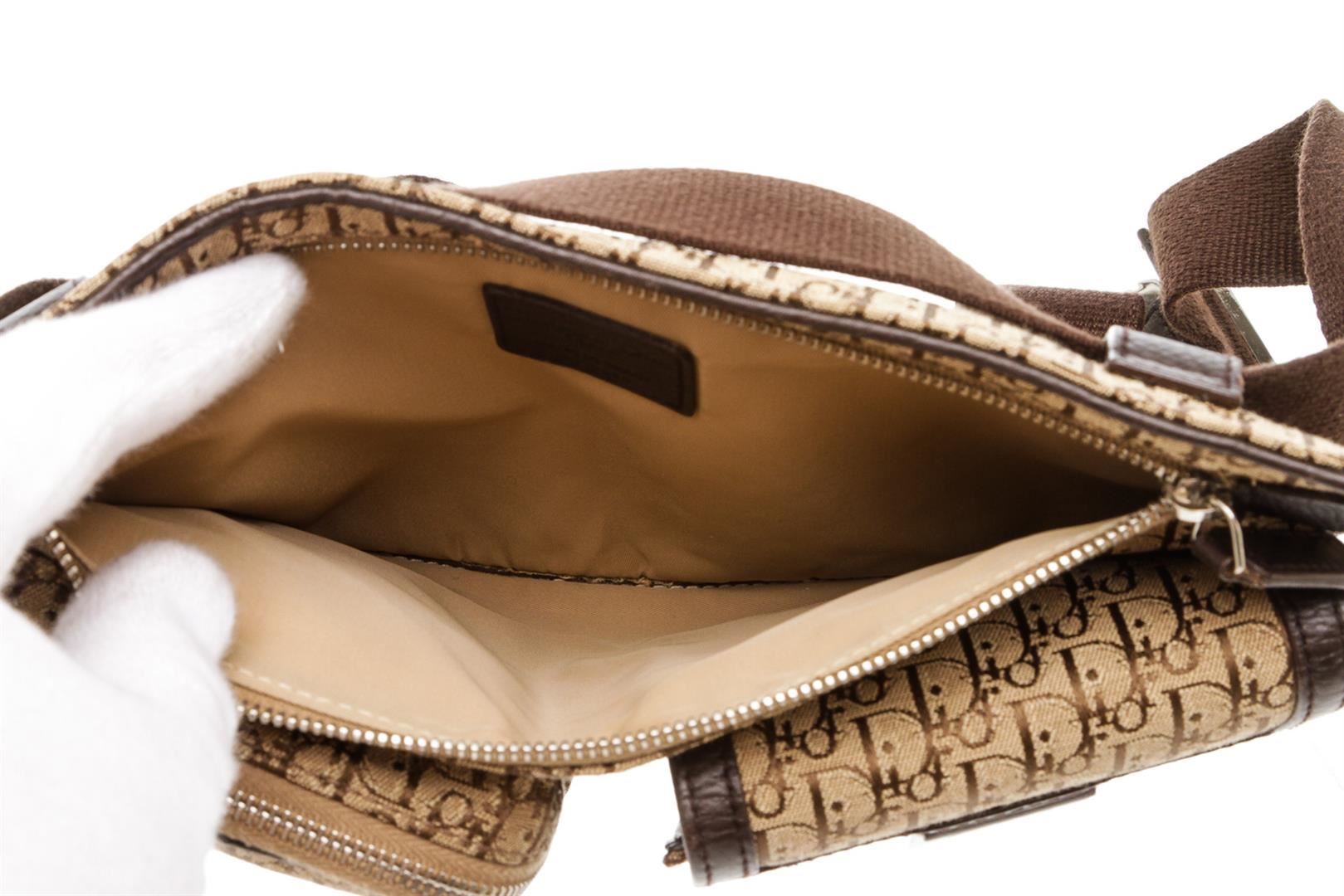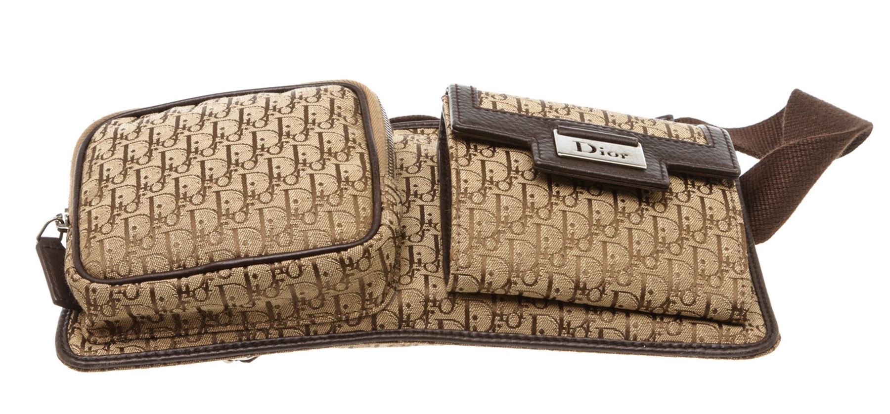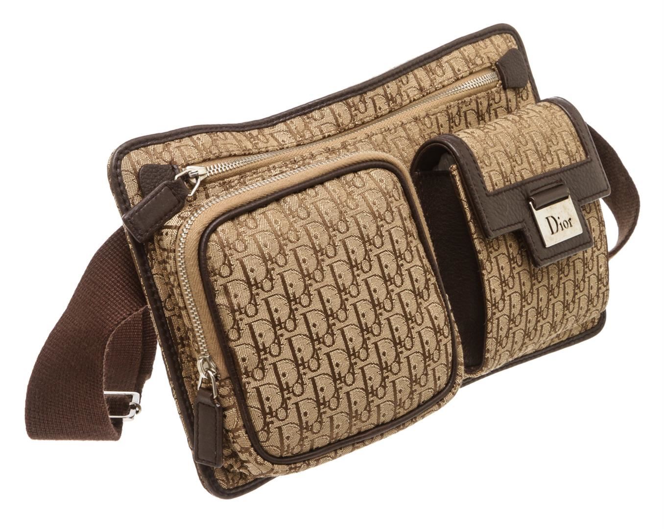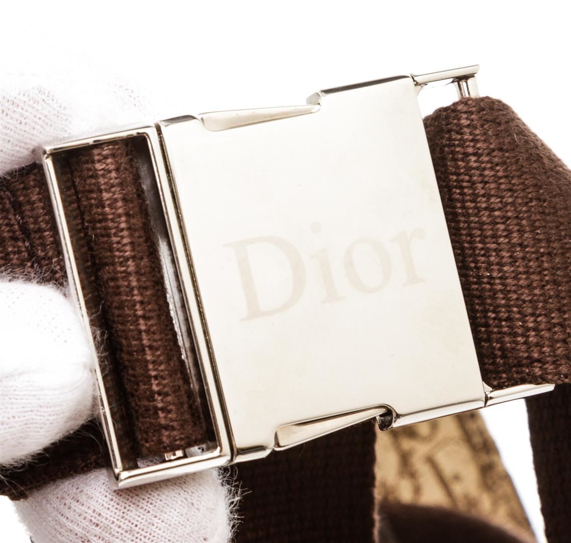 Chic Dior belt bag rendered in brown Trotter logo canvas, accented with silver-tone logo hardware and featuring three exterior compartments. Adjustable brown canvas waist strap, buckle closure on belt, zip and snap closures on compartments and nylon lining.