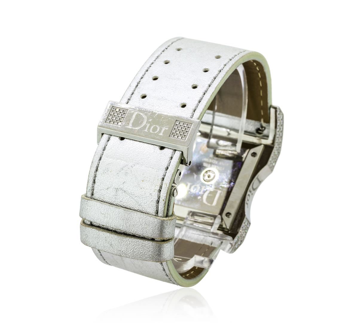 One lady's Christian Dior rectangle case wristwatch with a diamond bezel featuring: stainless steel and silver leather strap weighing 57.7 grams. The watch has a quartz movement with silver dial with luminous stainless steel hands, and the factory diamond set bezel.