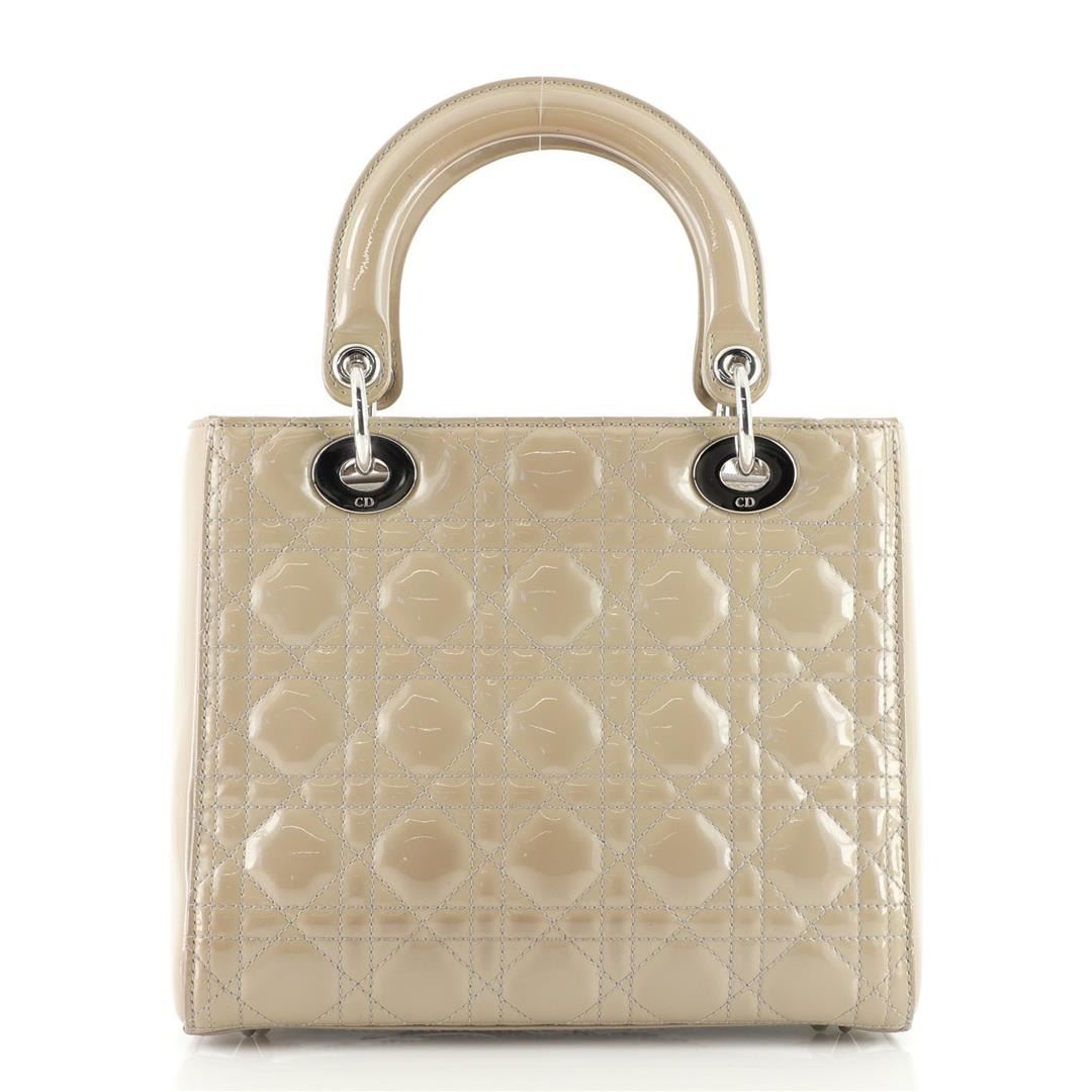 Christian Dior Lady Dior Bag Cannage Quilt Patent Medium. All available information is listed in the description and shown in the photos. Christian Dior Lady Dior Bag Cannage Quilt Patent Medium. Odor in interior. Wear, discoloration and small stains on exterior, handles and strap, creasing on strap. Pen marks in interior, scratches on hardware.