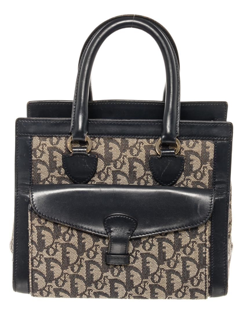 Christian Dior Navy Blue Logo Trotter Canvas Leather Small Tote Bag. All available information is listed in the description and shown in the photos. This tote features navy Dior jacquard canvas with navy leather trim and gold-tone hardware, dual navy rolled leather handles, front pocket with tab closure and an open, easy to get into top, five protective studs at the base, navy nylon lining with zippered pocket and flat pocket. Handle Drop 4", Height 8.5", Width 9.5", Depth 5"