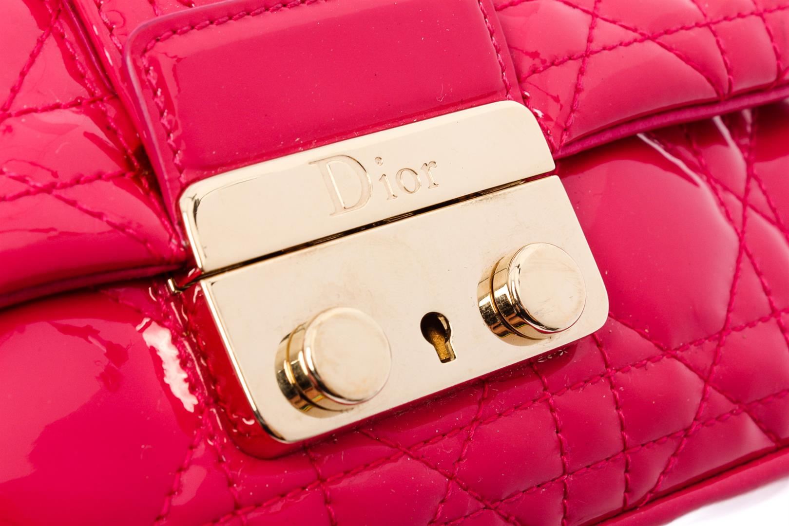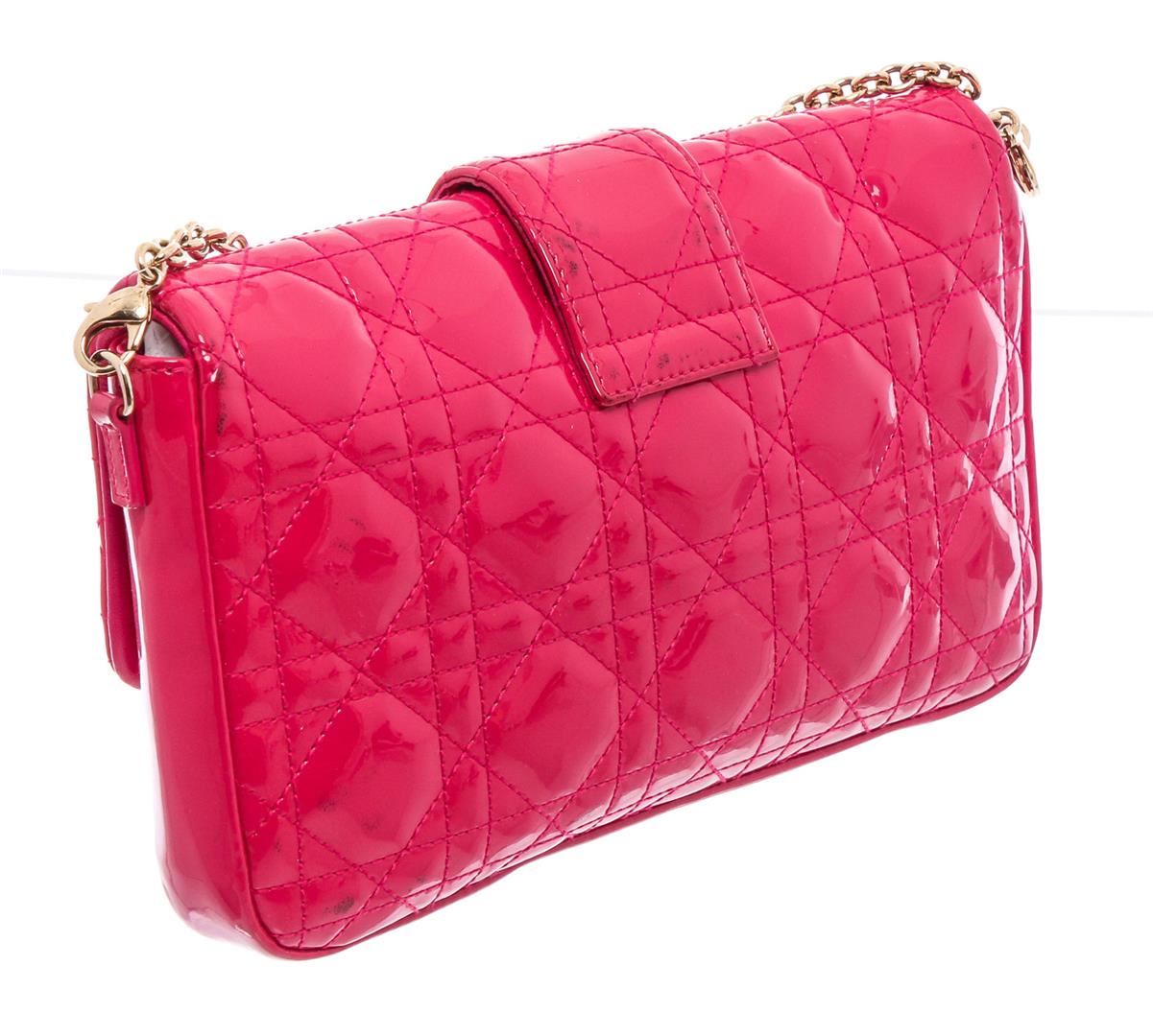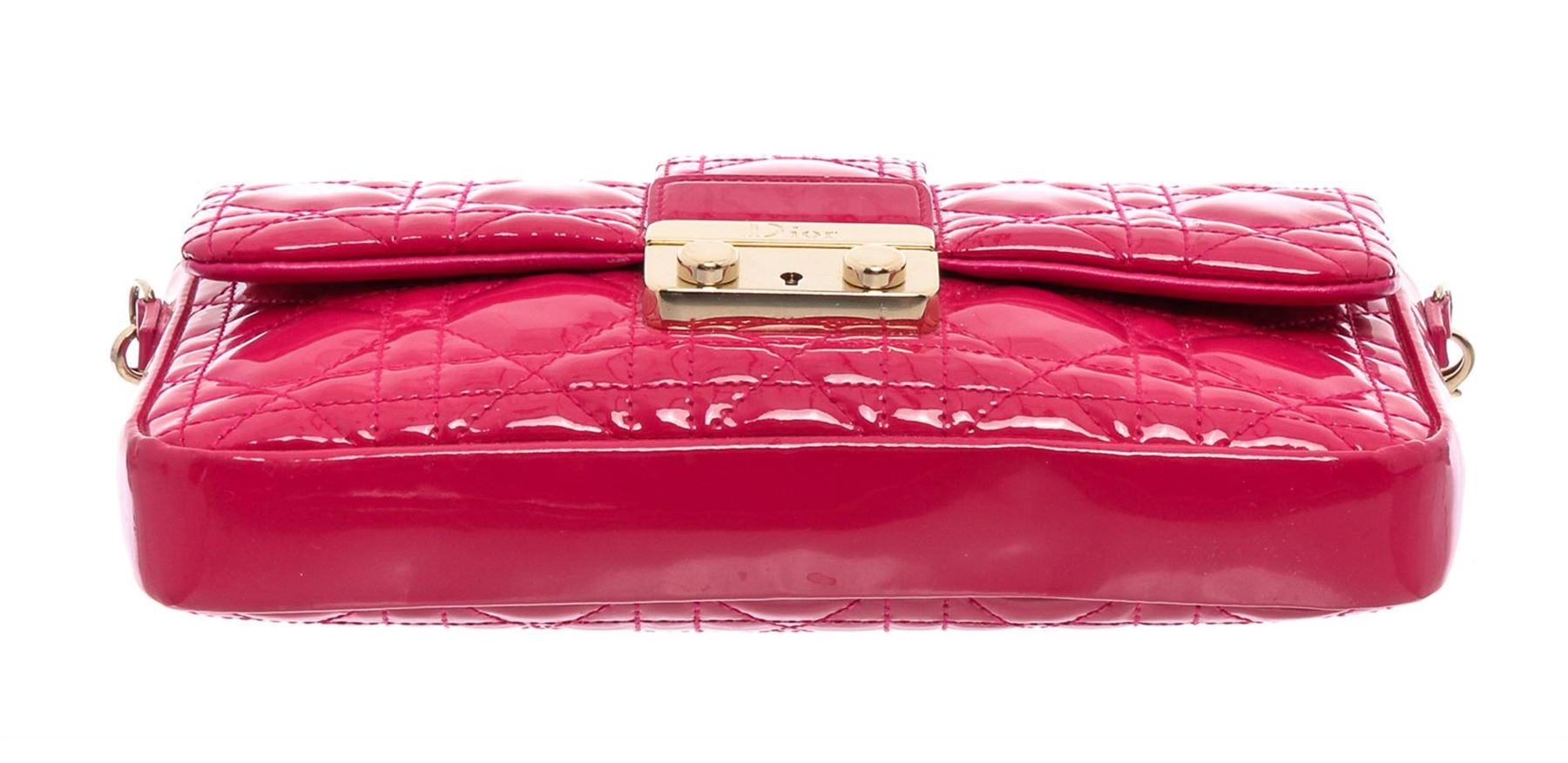 Pink quilted patent leather Christian Dior Promenade Pouch crossbody bag with silver-tone hardware, single drop-in chain-link shoulder strap, single bill compartment, tonal leather lining, six card slots at interior walls and S-Lock closure at front flap.