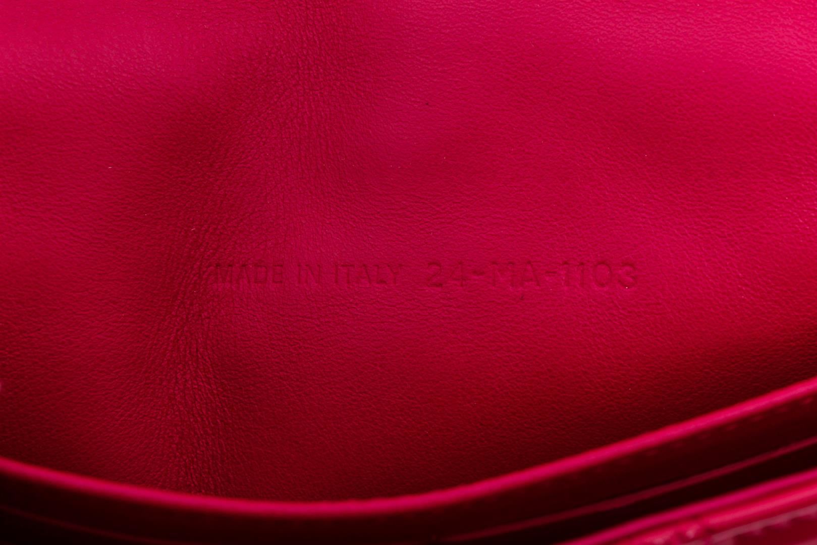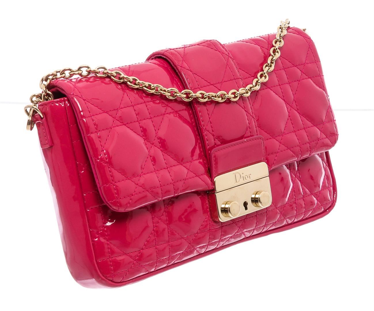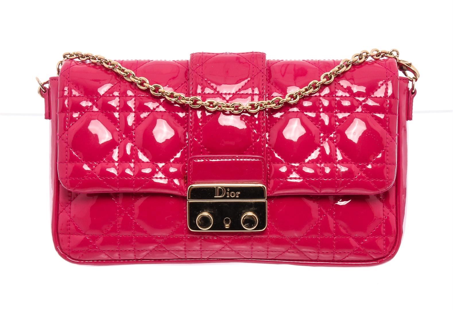 Pink quilted patent leather Christian Dior Promenade Pouch crossbody bag with silver-tone hardware, single drop-in chain-link shoulder strap, single bill compartment, tonal leather lining, six card slots at interior walls and S-Lock closure at front flap.
