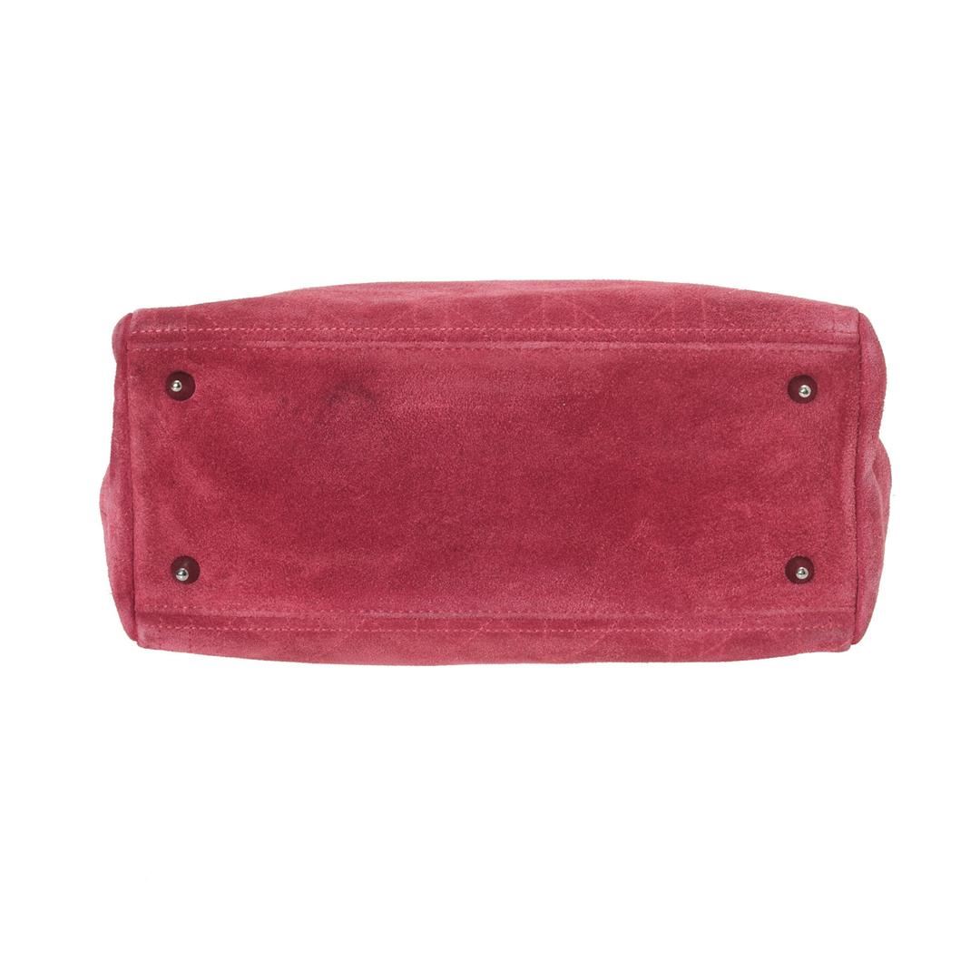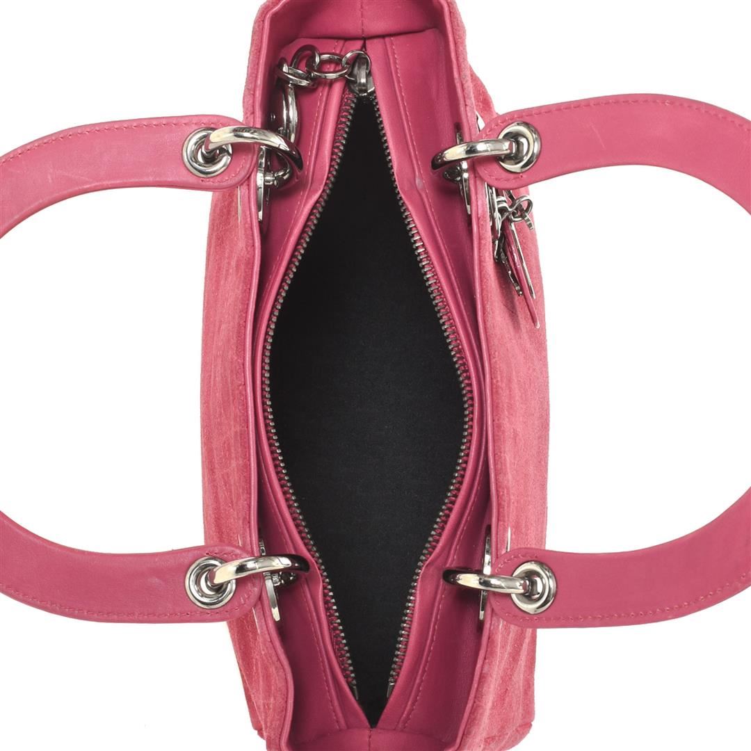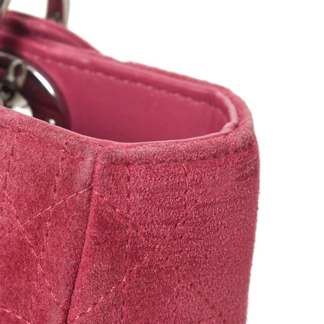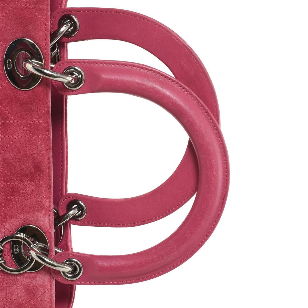 One Christian Dior Pink Quilted Cannage Suede Leather Medium Lady Dior Handbag. Item is sold AS-IS. All available information is listed in the description and shown in the photo. This pink Lady Dior medium handbags has been crafted from leather and suede and it carries the signature Cannage quilt. It is equipped with a black Oblique nylon interior and two top handles. The gorgeous piece is complete with the classic Dior letter charms and a leather detachable shoulder strap. 9.5" L x 4.5" W x 8" H Handle Drop: 4" and 16"