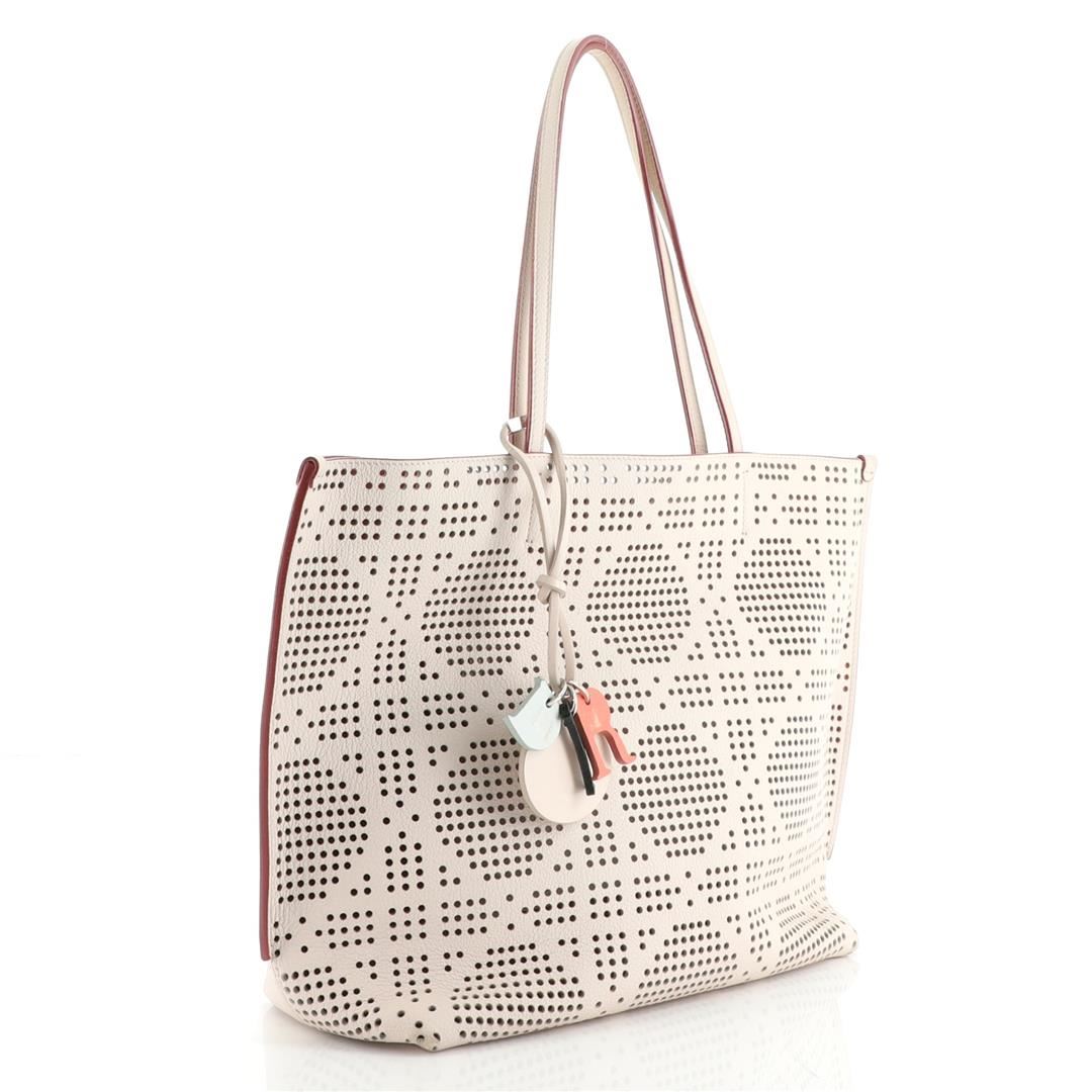 One Christian Dior Shopping Tote Perforated Leather Medium. Item is sold AS-IS. All available information is listed in the description and shown in the photo. Christian Dior Shopping Tote Perforated Leather Medium. Moderate cracking on handle base and opening trim wax edges, heavy wear and darkening on base corners, minor creasing on exterior. Glue stains on base, scratches on hardware. 78848
