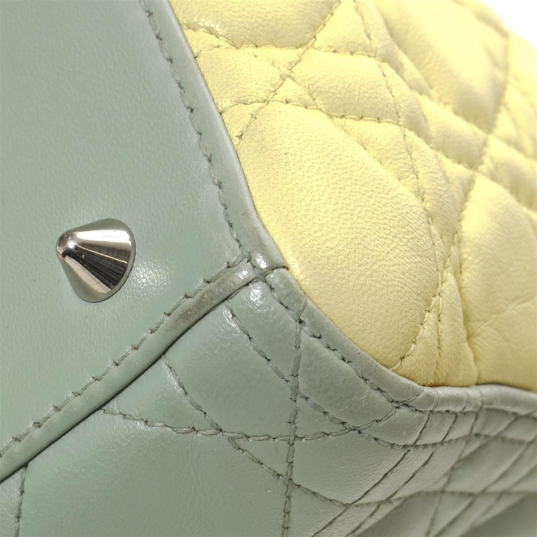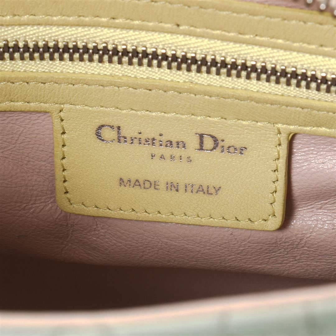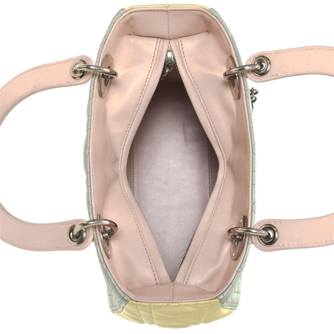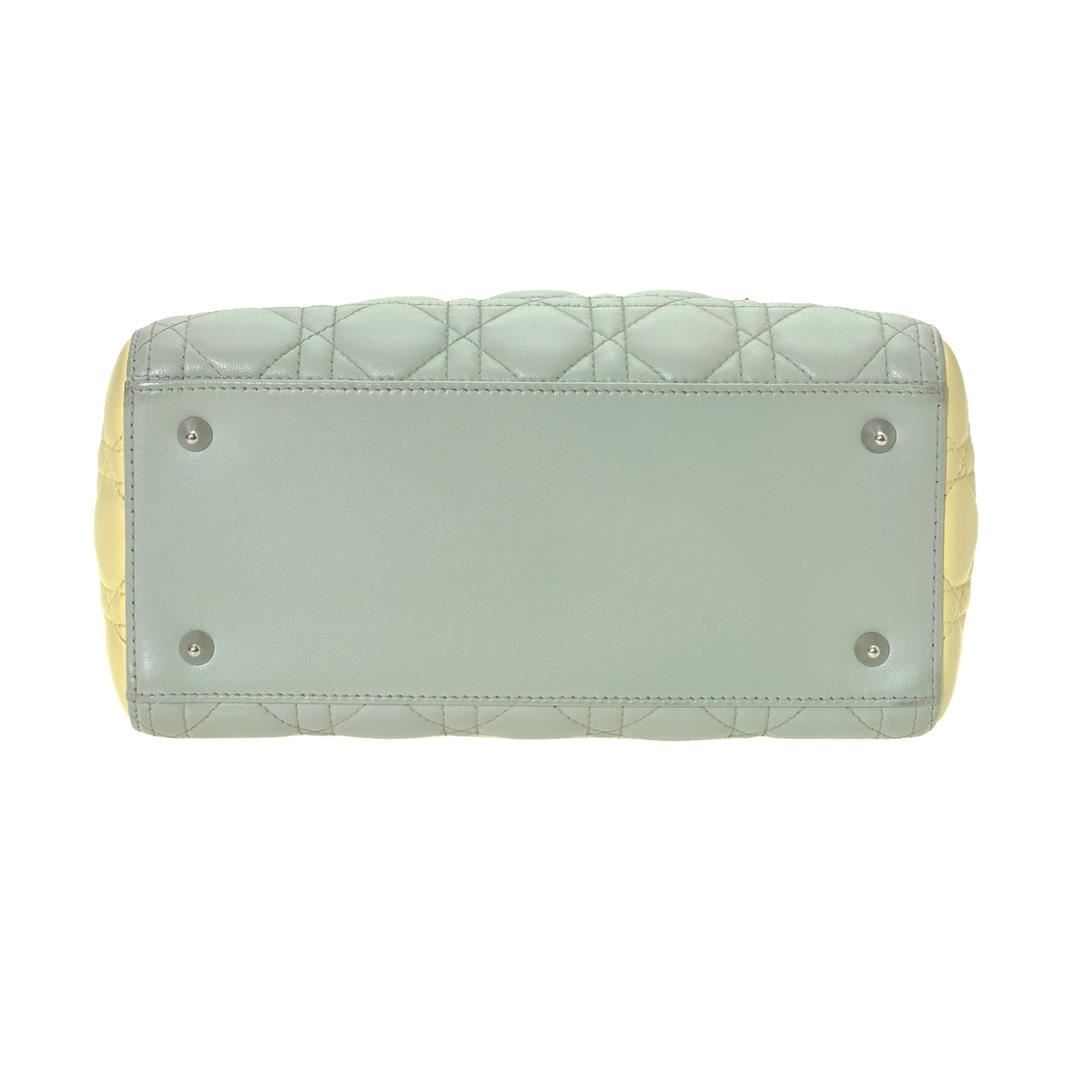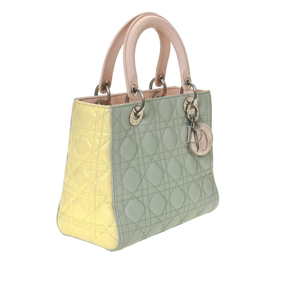One Christian Dior Tricolor Cannage Quilted Lambskin Leather Medium Lady Dior Handbag. Item is sold AS-IS. All available information is listed in the description and shown in the photo. Pink, yellow and green Cannage quilted Lambskin leather Christian Dior Medium Lady Dior handbag with silver-tone hardware, dangling DIOR letter charms, double flat leather top handles, pink leather removable shoulder strap, pink leather lining with one zipped pocket inside. 9.5" L x 4.5" W x 8" H Handle Drop: 4" and 16"