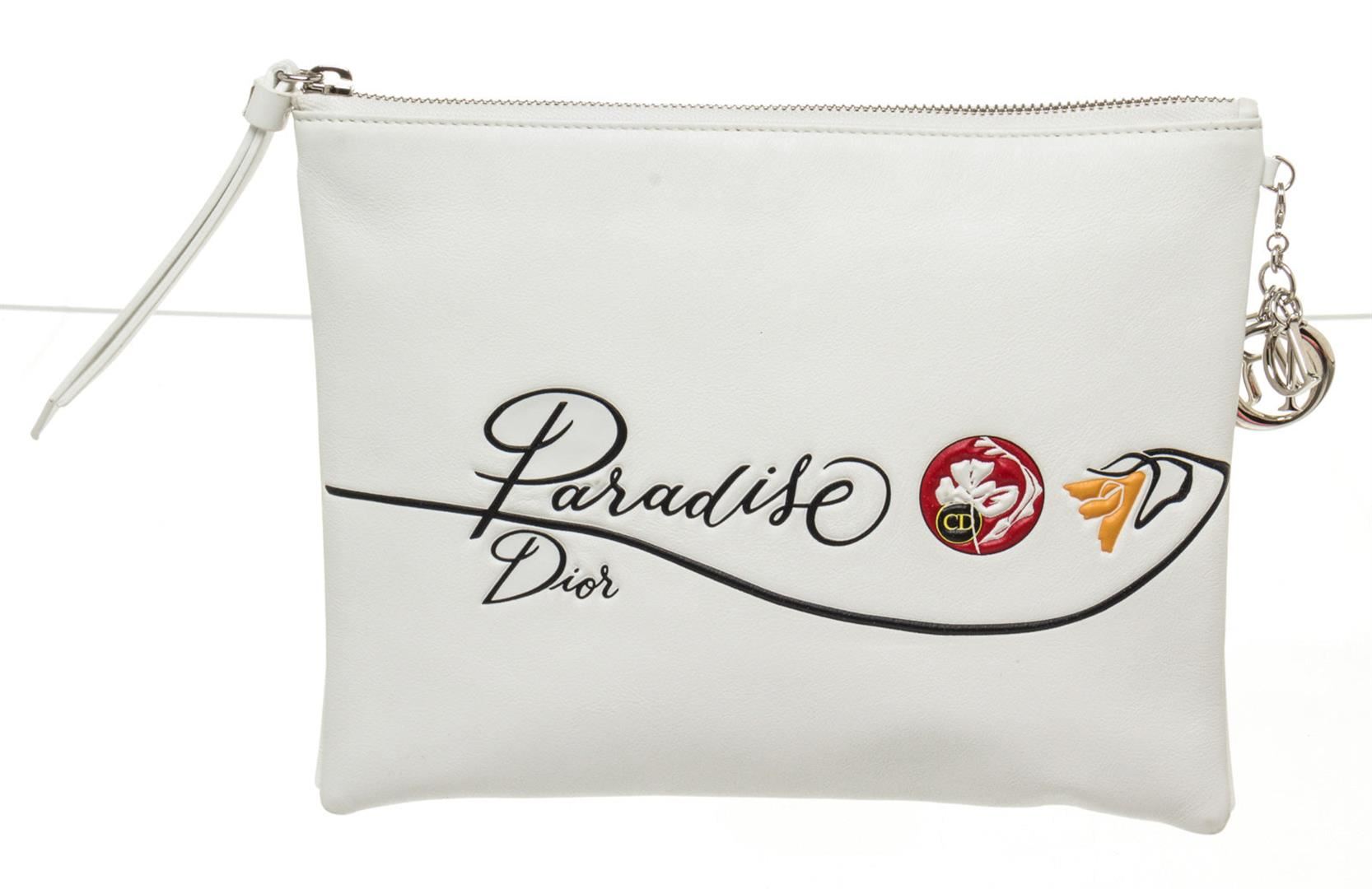 Christian Dior White Leather Paradise Zip Pouch Wallet. All available information is listed in the description and shown in the photos. Christian Dior White Leather Paradise Zip Pouch Wallet with leather, gold-tone hardware, interior slip pockets and zipper closure.
