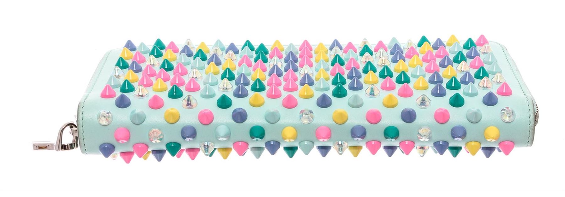 Sky leather Christian Louboutin Panettone wallet with silver-tone hardware, multicolor conical stud embellishments throughout, red leather lining, three interior compartments; one with zip closure, dual bill compartments, 12 card slots and zip-around closure.