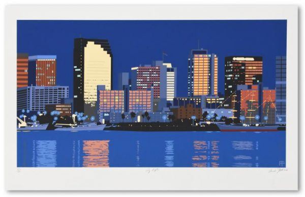 A limited edition 31x17 serigraph on paper by the late great Armond Fields, depicts downtown USA lit up for nightlife. Signed with COA