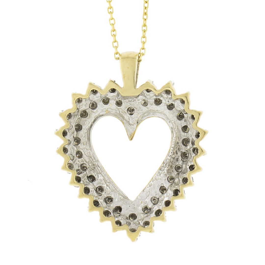 A solid 14k yellow & white gold heart pendant necklace, with 51 round cut natural diamonds (Fancy Light Champagne Color- SI2-I2 ; 1ctw) . Adjustable 16 or 18 inch cable link chain, 5.69 grams total weight, pendant measures 26.8x21.8mm.