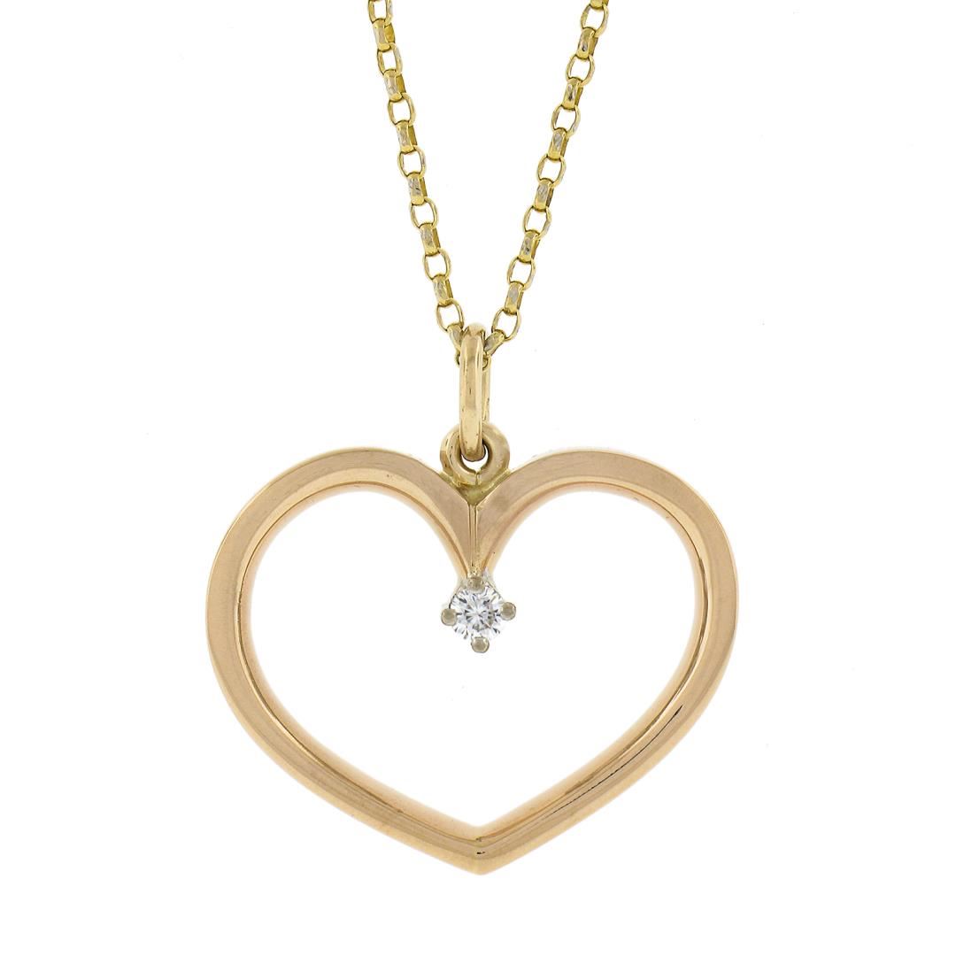 A solid 18k yellow, rosy yellow & white gold heart pendant necklace, with 1 round cut natural diamond (G - VS2 ; 0.05ct). 18 inch rope link chain, 7.16 grams total weight, pendant measures 23.2x23.1mm.