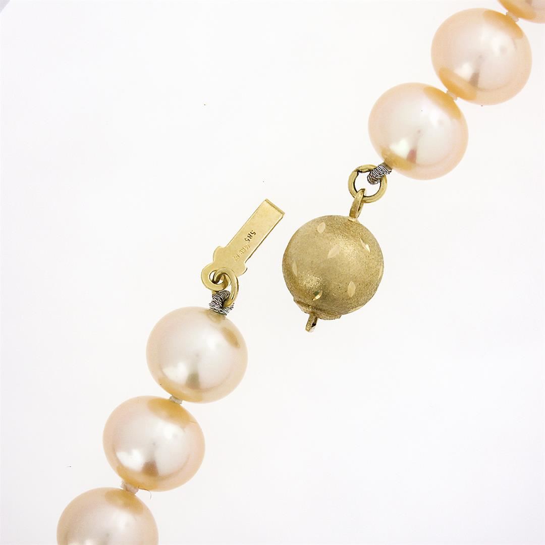 A strand necklace with 14k yellow gold clasp, with 54 round shape cultured pearls (8.0mm to 8.5mm each). 17.5 inch strand link chain, 40.69 grams total weight, clasp thickness measures 8.0mm.