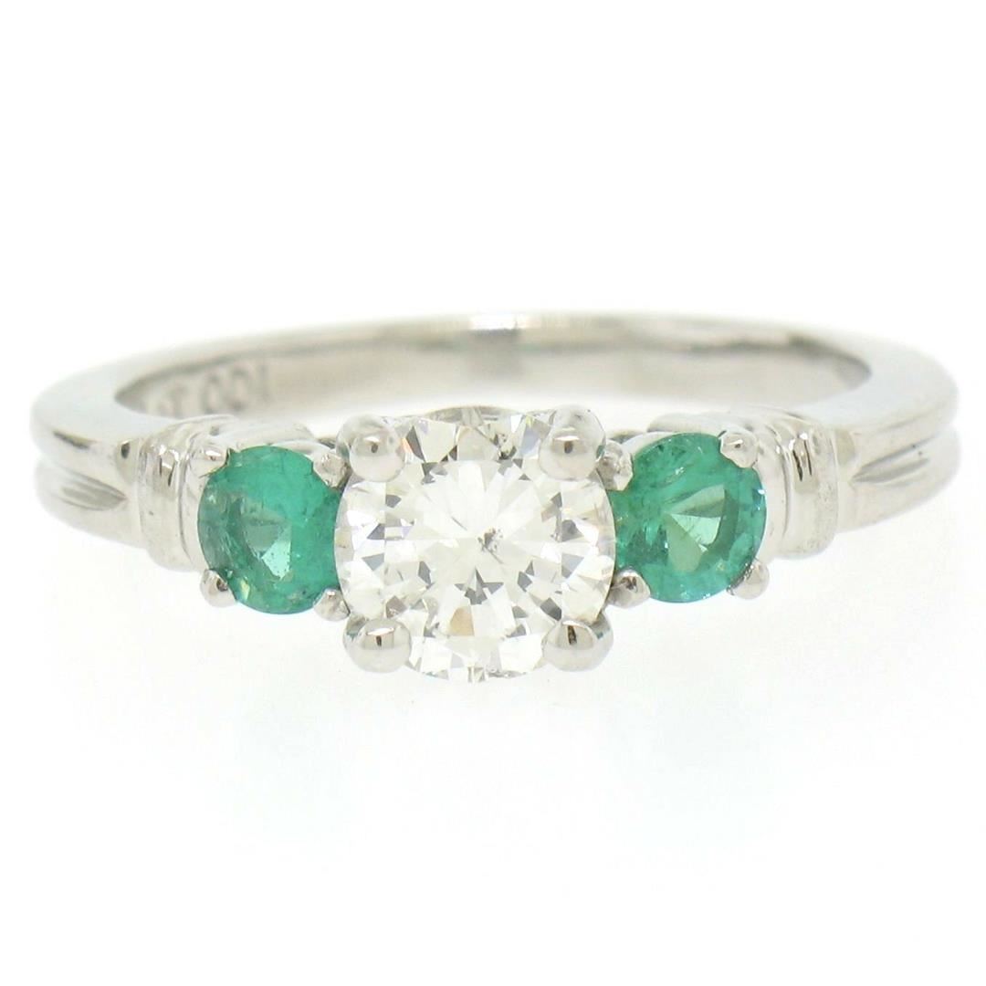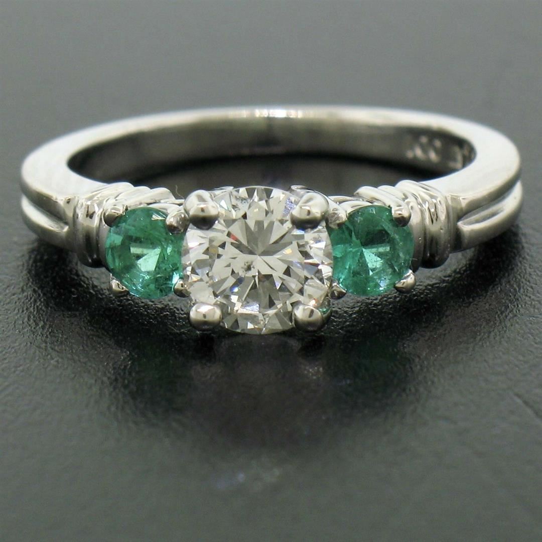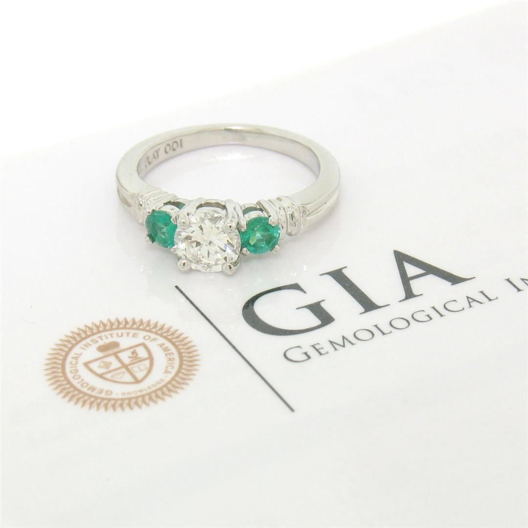 A new solid platinum 3 stone ring with 1 GIA certified natural diamond (H - SI2; 0.71ct) and 2 natural emeralds (0.44ctw). The ring is size 6.0, weighs a total of 5.7 grams, and measures 5.7mm wide. Comes with all original relevant certifications.