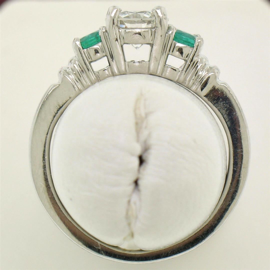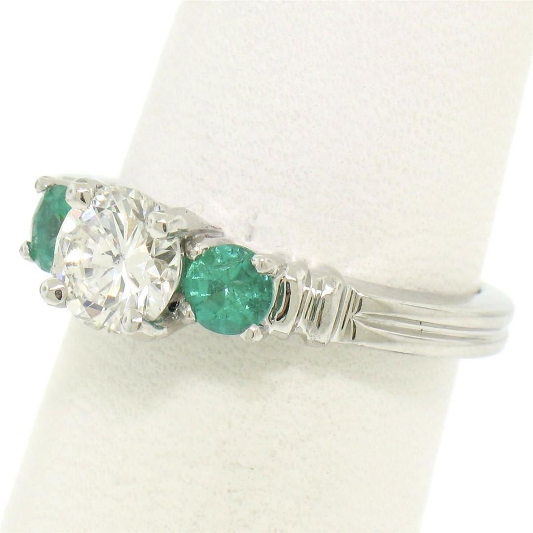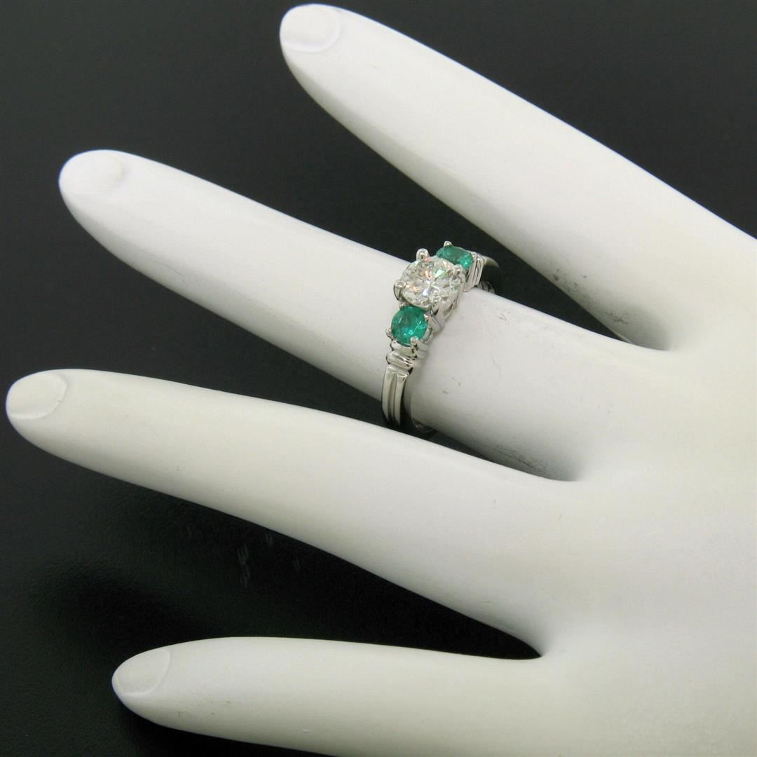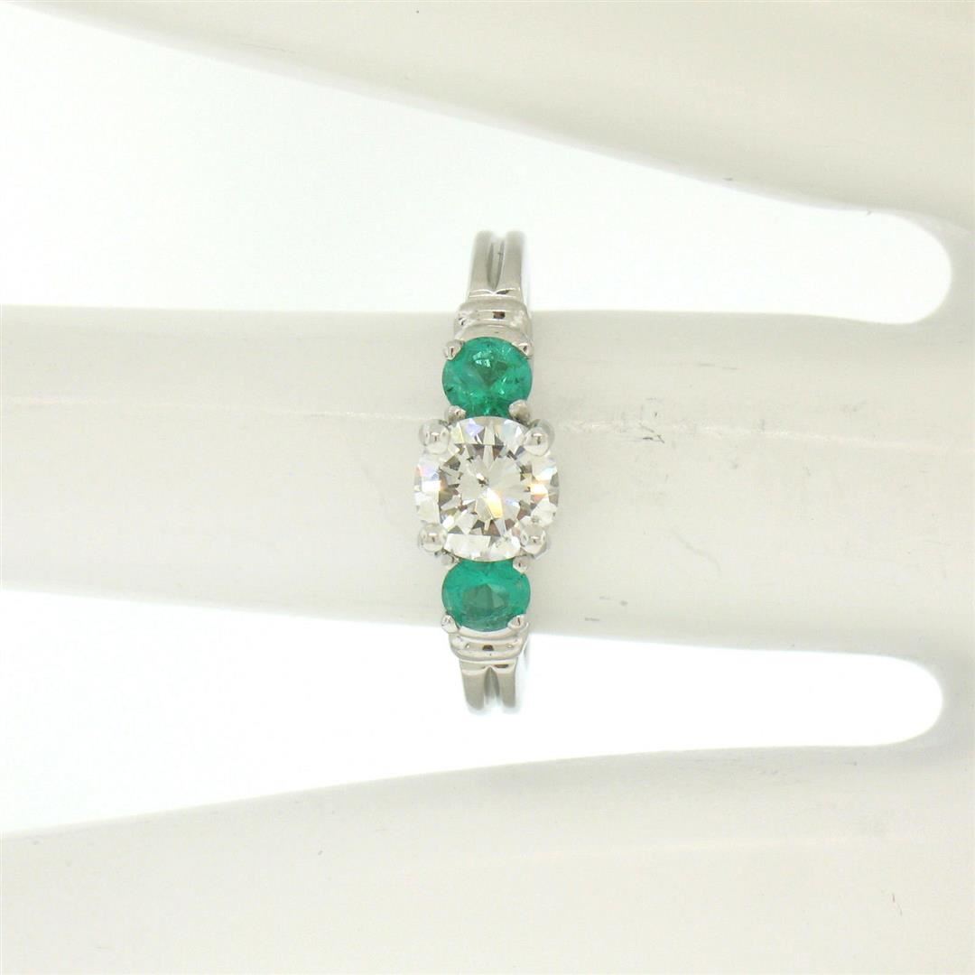 A new solid platinum 3 stone ring with 1 GIA certified natural diamond (H - SI2; 0.71ct) and 2 natural emeralds (0.44ctw). The ring is size 6.0, weighs a total of 5.7 grams, and measures 5.7mm wide. Comes with all original relevant certifications.