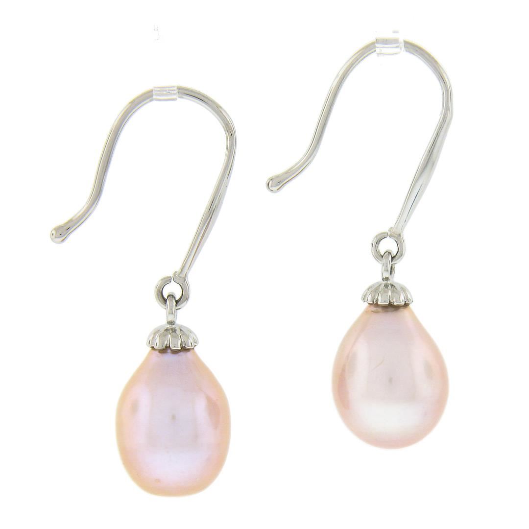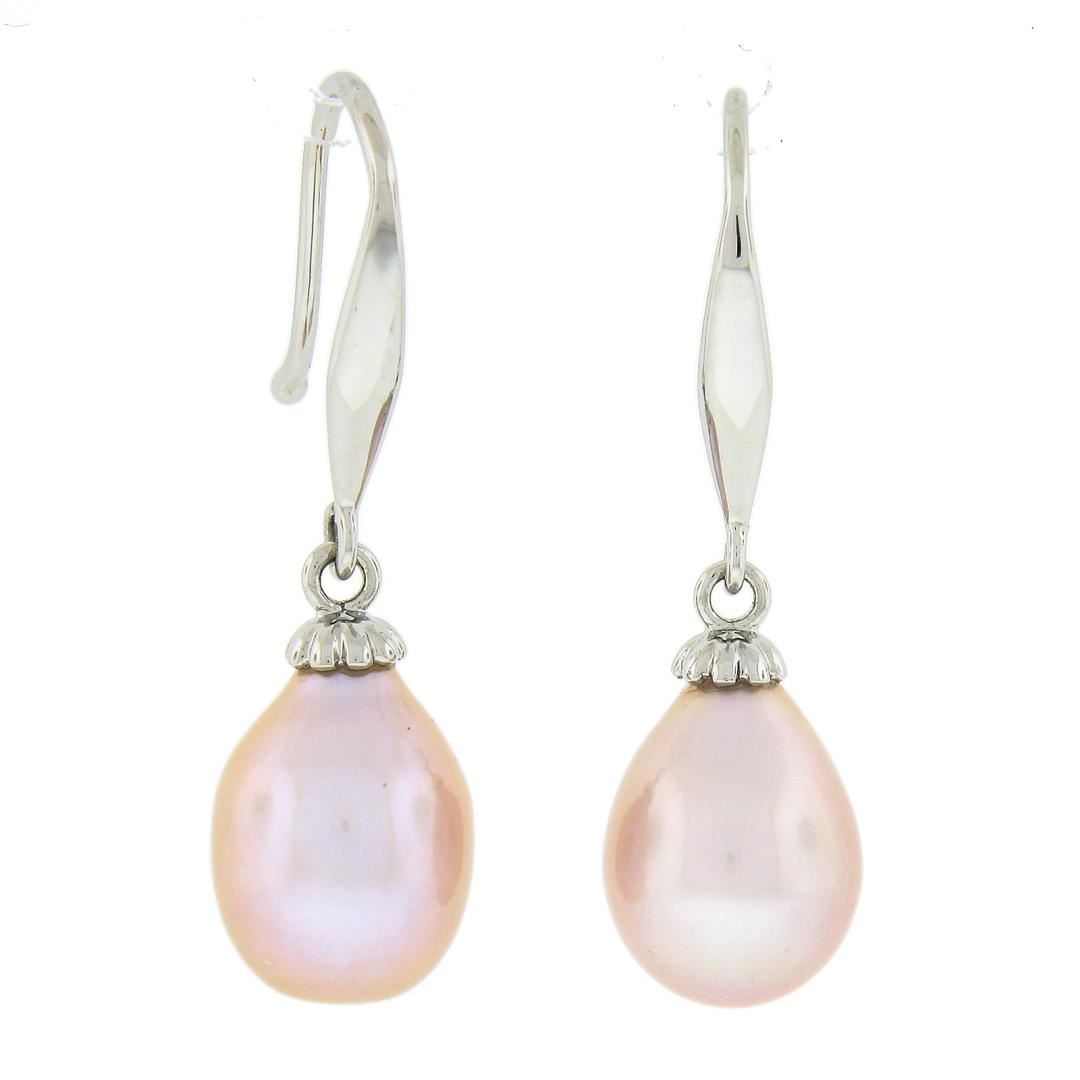A solid 14k white gold drop dangle earrings, with 2 teardrop shape cultured pearls ( 8.7x11.3mm each). The earrings measure approximately 30.2x2.5mm and weigh a total of 3.10 grams.