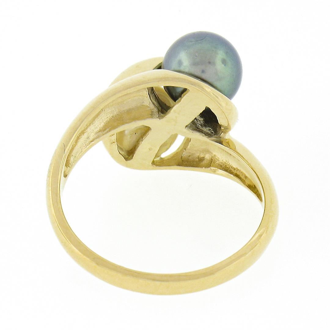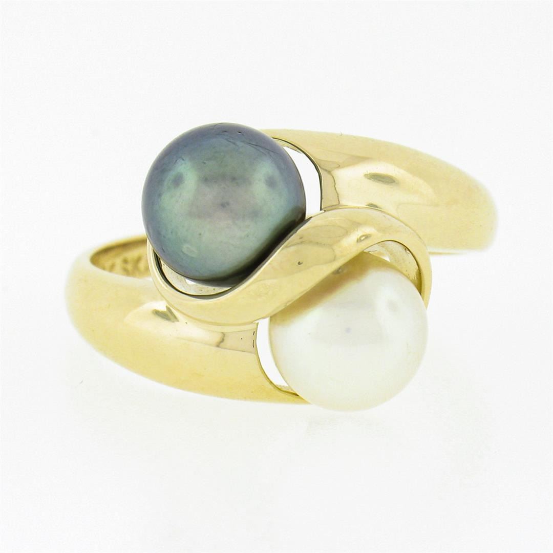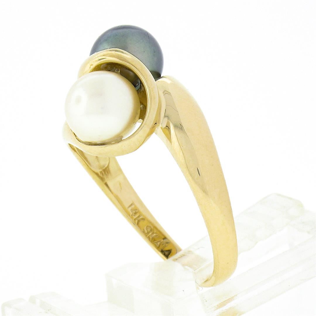 A solid 14k yellow gold ring, with 2 round shaoe cultured pearls (6.8mm & 6.9mm each). The ring is size 6.5, weighs a total of 4.25 grams, and measures 12.75mm wide.