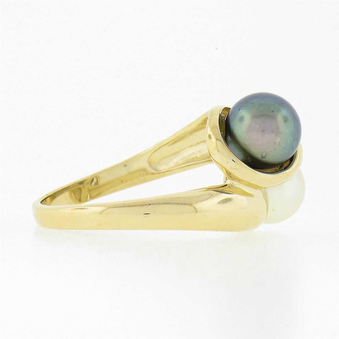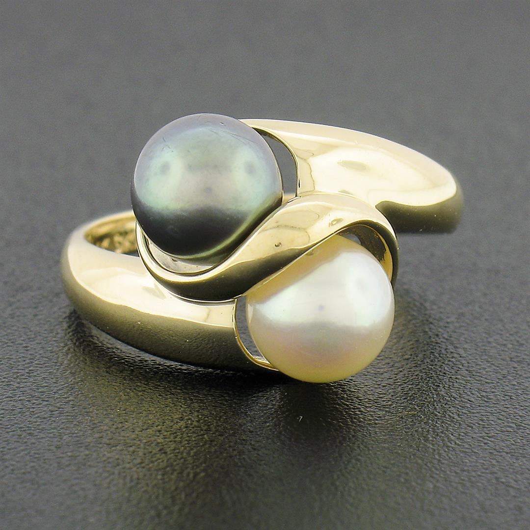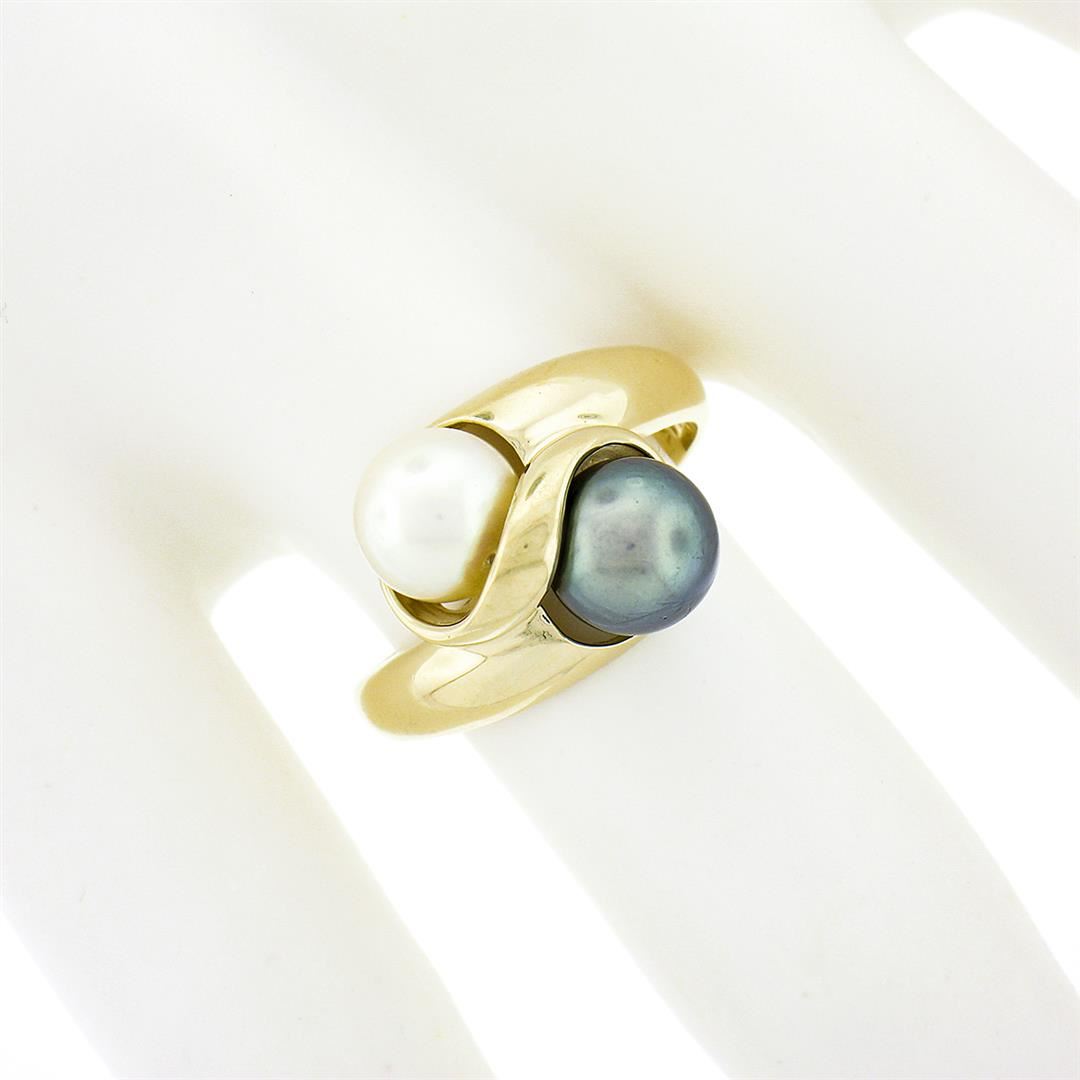 A solid 14k yellow gold ring, with 2 round shaoe cultured pearls (6.8mm & 6.9mm each). The ring is size 6.5, weighs a total of 4.25 grams, and measures 12.75mm wide.