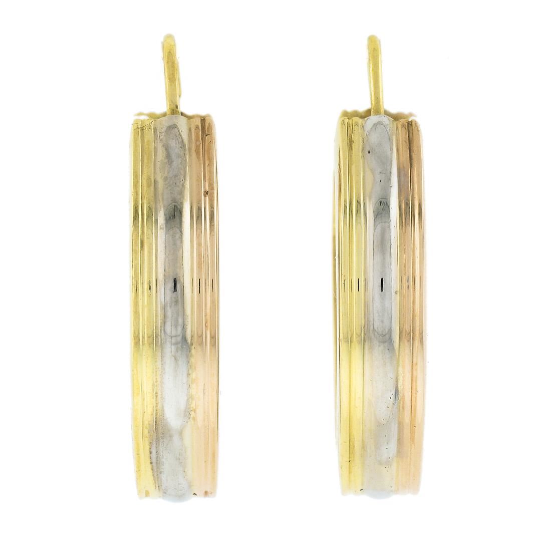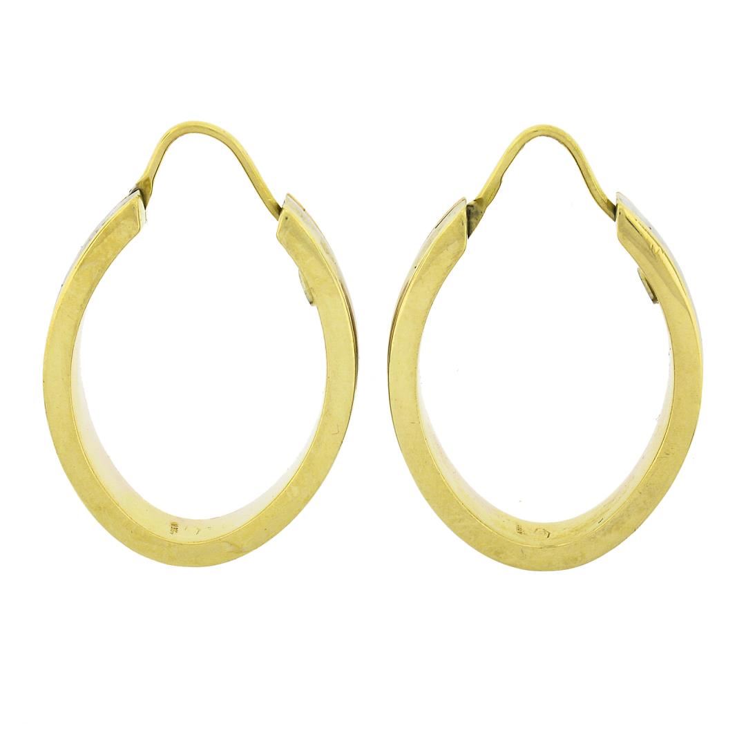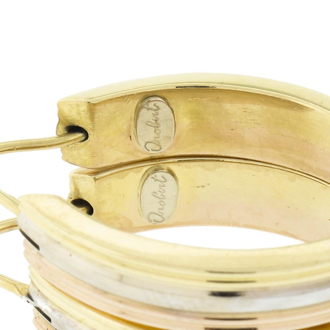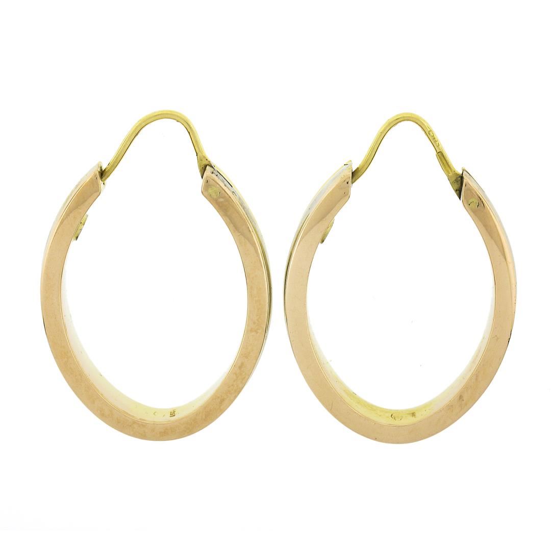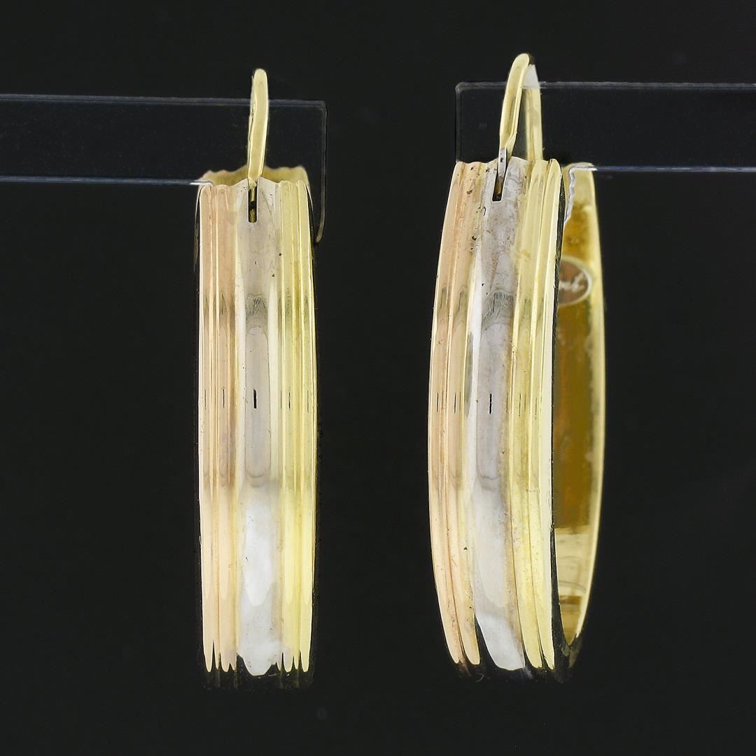 A solid 18k rose, white & yellow gold hoop earrings. The earrings measure approximately 31.2x21.9mm and weigh a total of 9.47 grams.