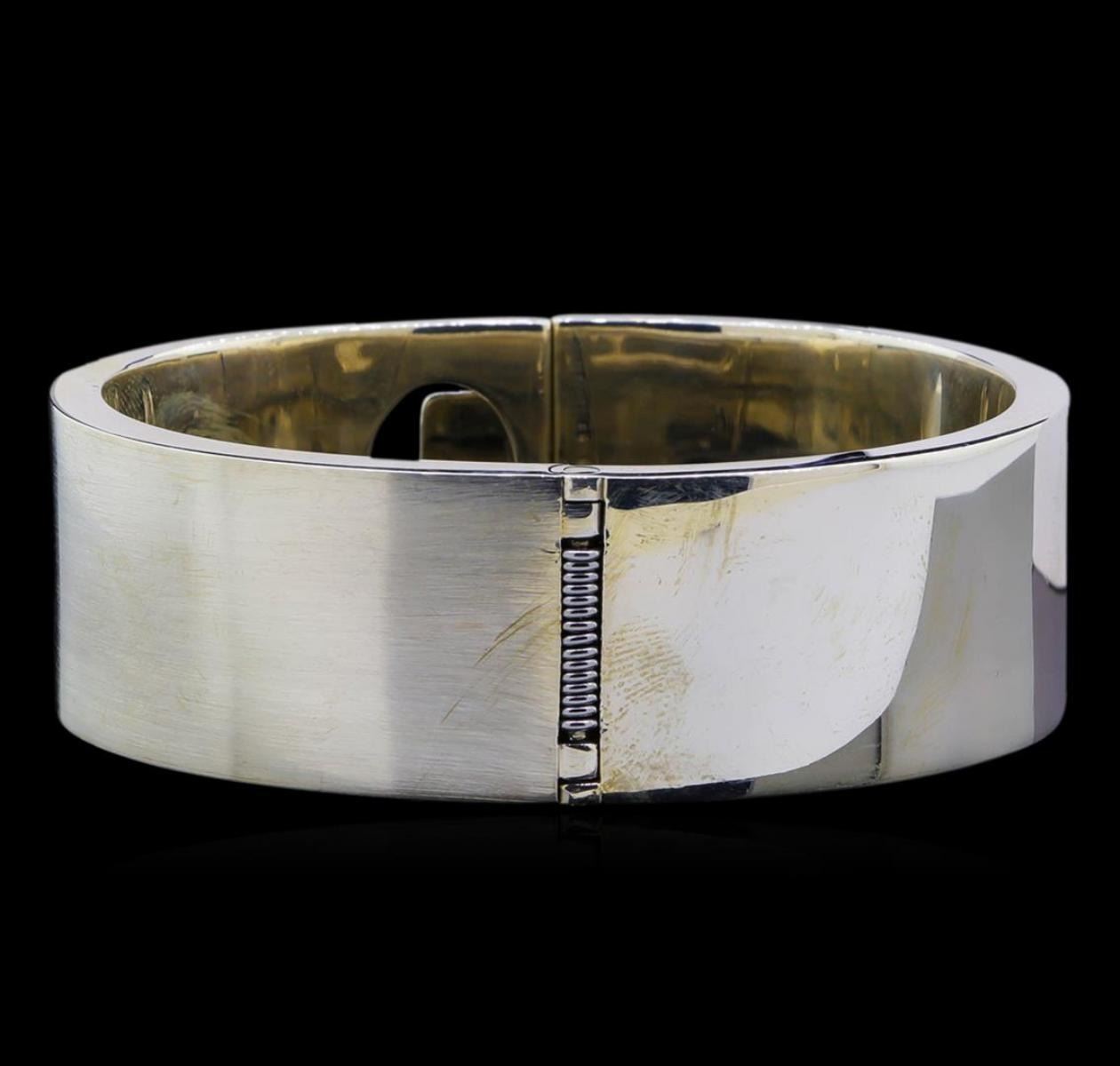 One of a kind high fashion sterling silver bracelet weighing 128.7 grams. This sterling silver promises a lasting shine.
